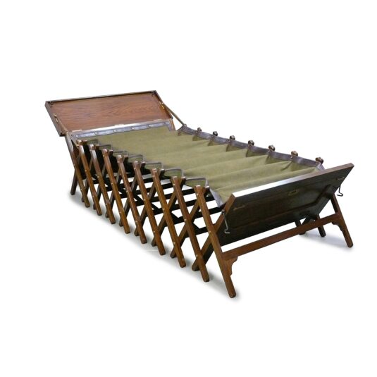 FOLDING CAMPAIGN BED TEAK GREEN CANVAS TRIMMED IN DARK TAN LEATHER 19TH CENT. STYLE 206 CM LONG 91 CM WIDE 66 CM HIGH