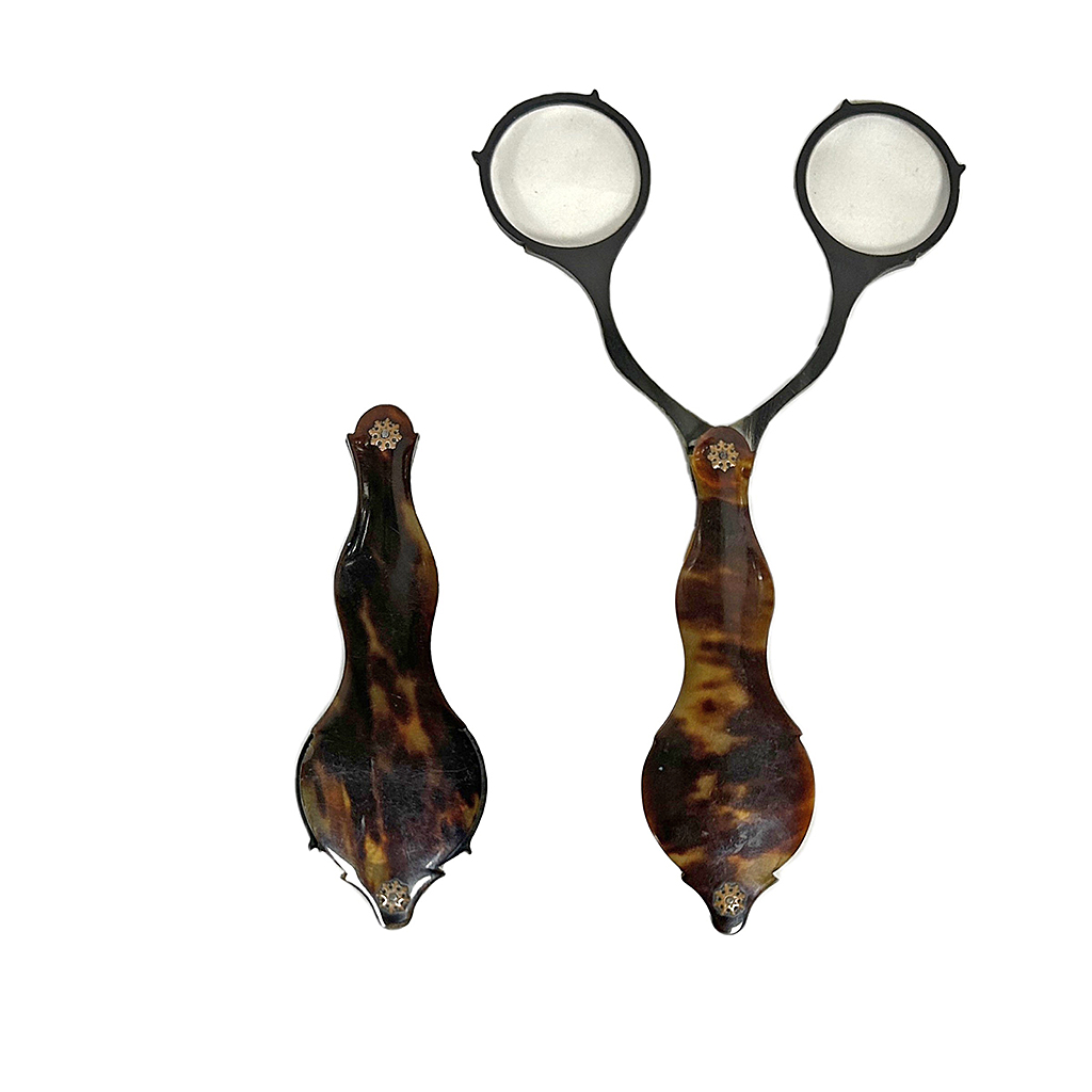 FOLDING TORTOISESHELL LORGNETTES / SPECTACLES WITH TWO ARMS AND SMALL SILVER DETAILS 11 CM (FOLDED)