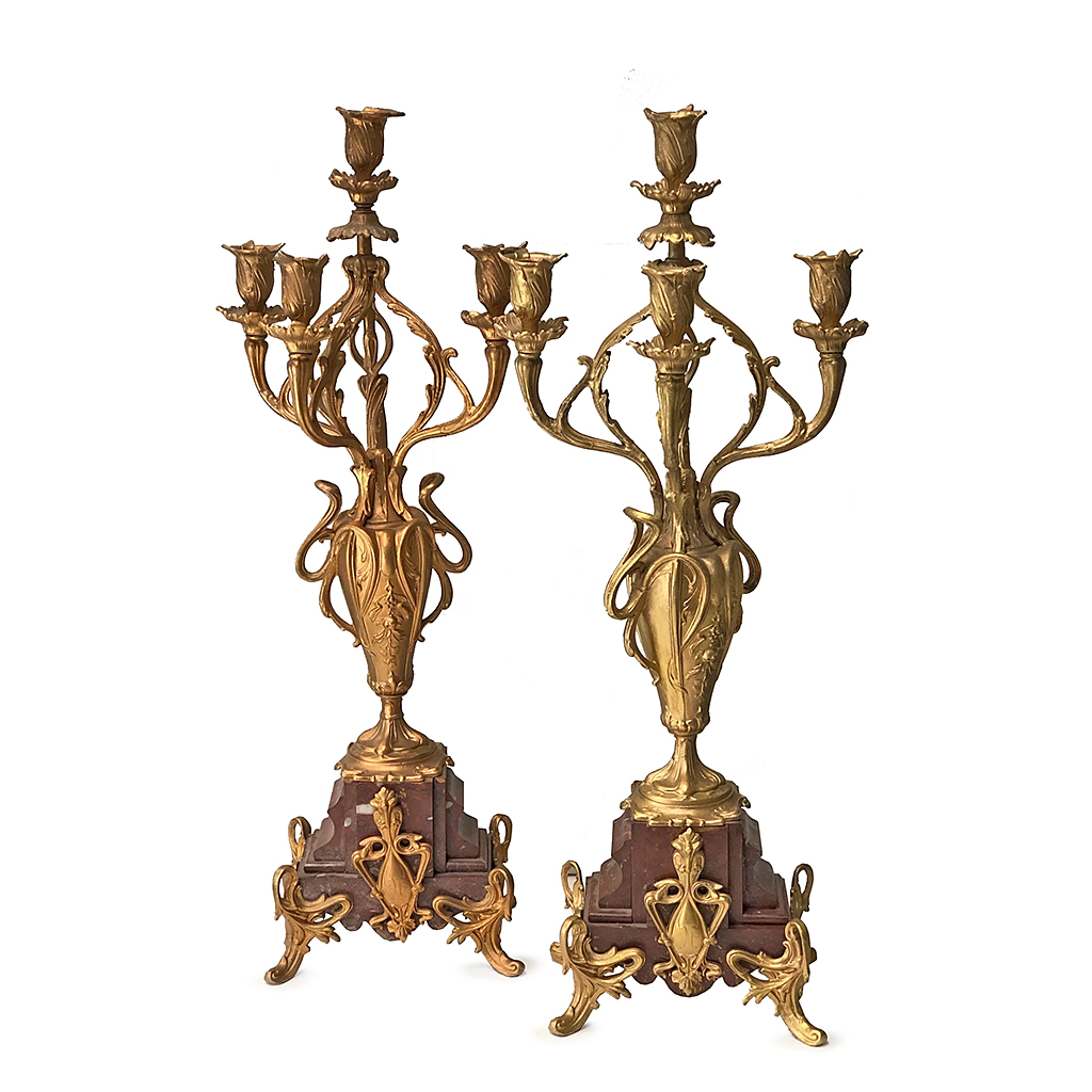 FOUR LIGHT FRENCH ORMOLU CANDELABRA ON MARBLE BASE WITH ORMOLU FEET BELLE EPOQUE CIRCA 1910 64 CM HIGH (X2)