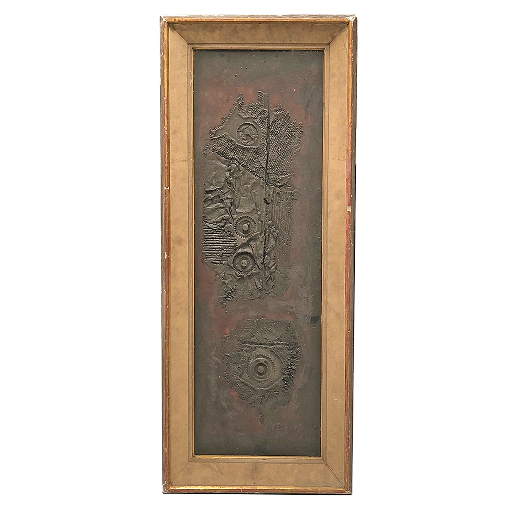 FRAMED ABSTRACT COLLAGE METAL ON CANVAS IGAEL TUMARKIN 1933-2021 116 CM HIGH 48 CM WIDE INC FRAME
