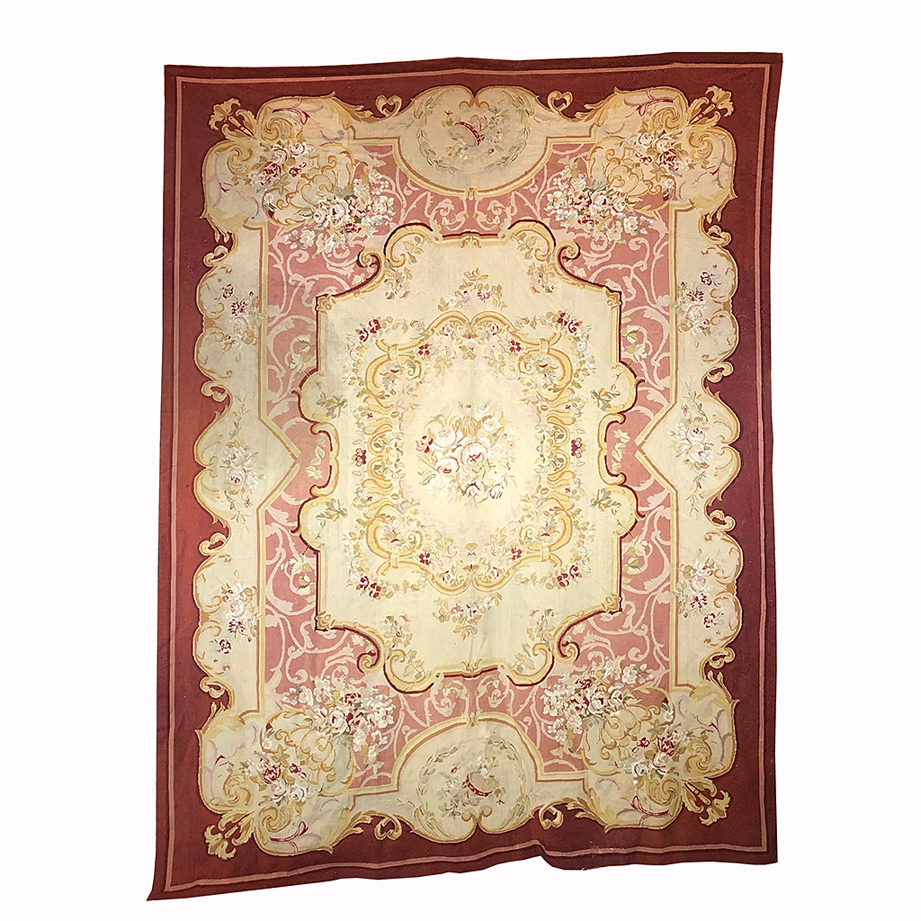 FRENCH AUBUSSON STYLE WOVEN RUG / CARPET PASTEL PINKS AND BROWNS 355 CM X 258 CM