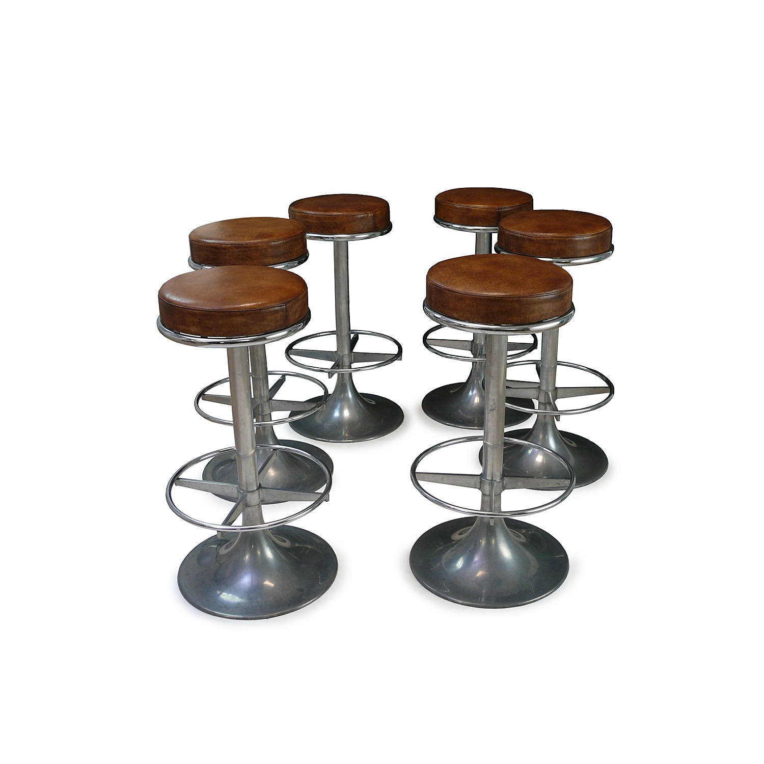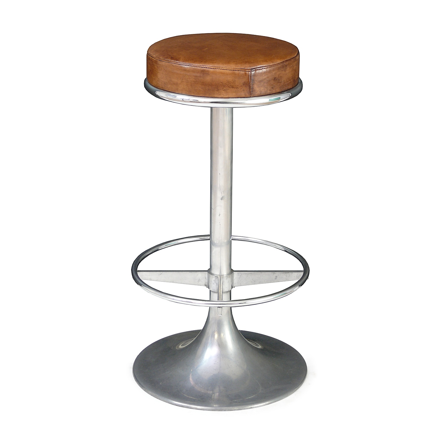 FRENCH BAR STOOL POLISHED ALLUMINIUM WITH CHESTNUT TAN LEATHER SEAT 78 CM HIGH 41 CM DIAM BASE (X6)