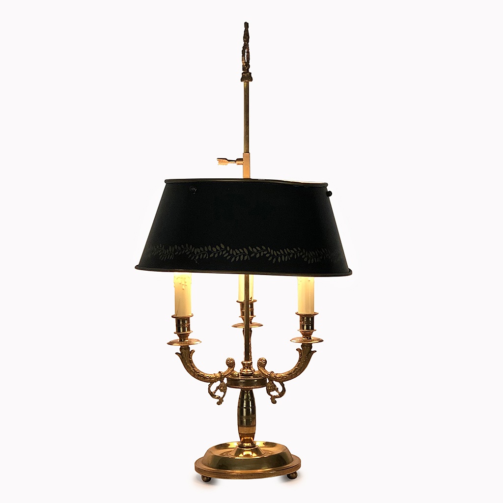 FRENCH BOUILLOTTE DESK LAMP ORMOLU THREE BRANCH WITH DARK GREEN PLAIN TOLL SHADE 56 CM HIGH 35 CM WIDE
