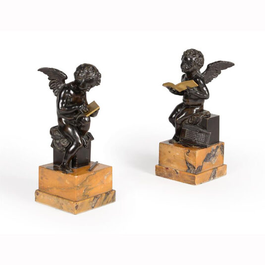 FRENCH BRONZE AND GILT METAL WINGED CHERUB 19TH CENTURY THE FIGURES SEATED ONE HOLDING A BOOK THE OTHER WITH A SLATE AND FLUTE ON AMBER SIENA MARBLE BASE 30 CM HIGH (X2)