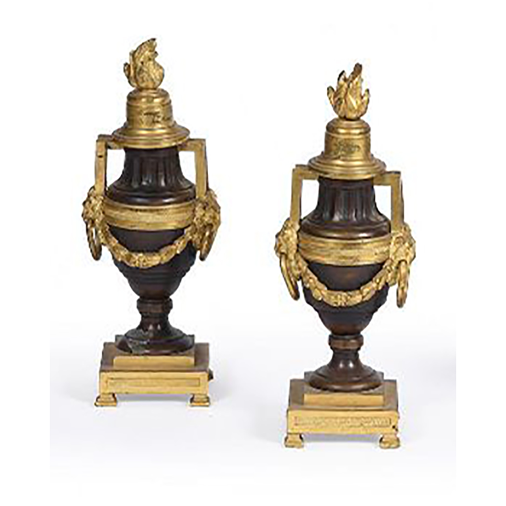 FRENCH BRONZE AND ORMOLU CASSOLETTES / URN IN THE MANNER OF DESIGNS BY CAFFIERI, LATE 18TH CENTURY WITH FLAMBO FINIAL AND LION HEAD MOUNTS REVERSIBLE LID 21 CM HIGH 6.5 CM DIAM (X2)