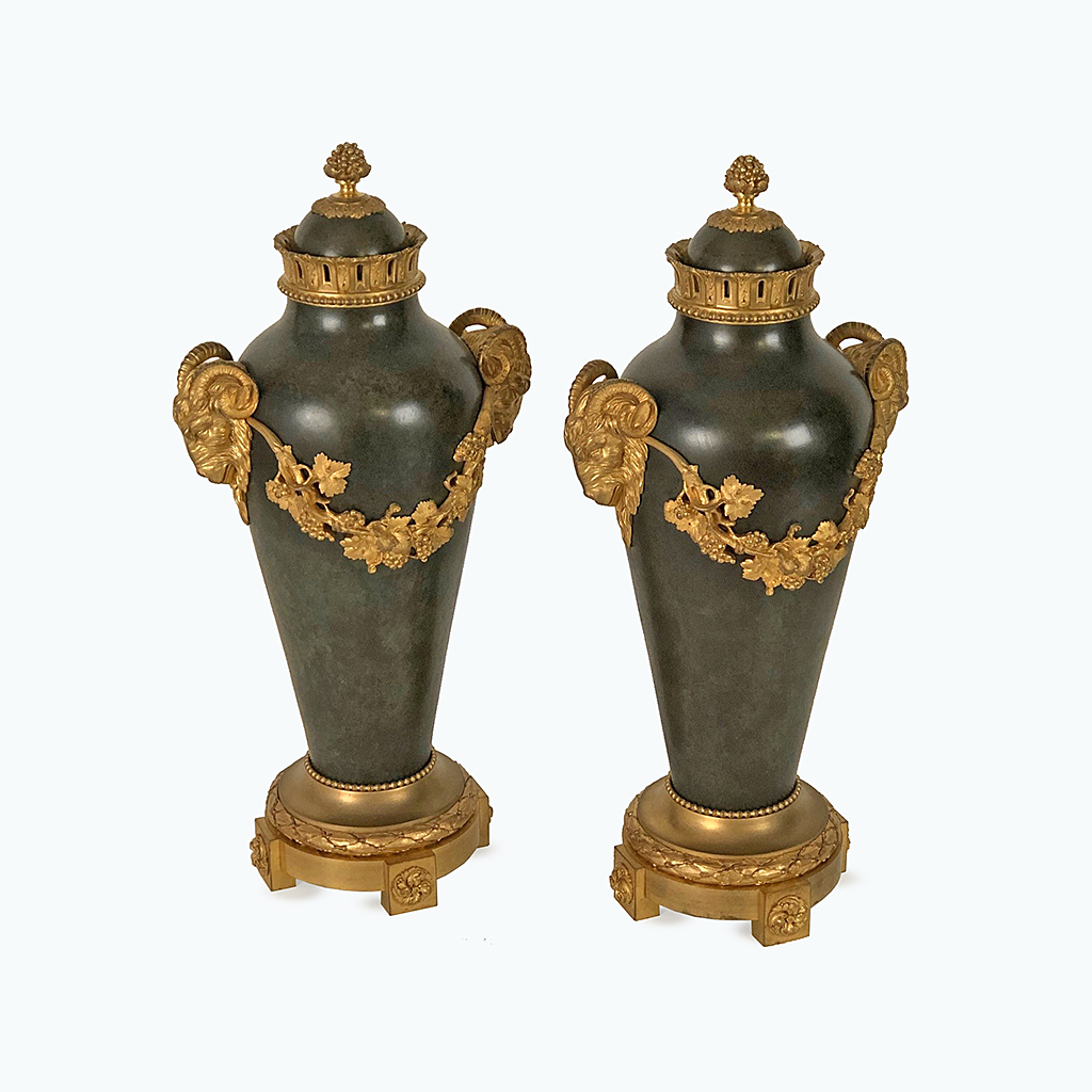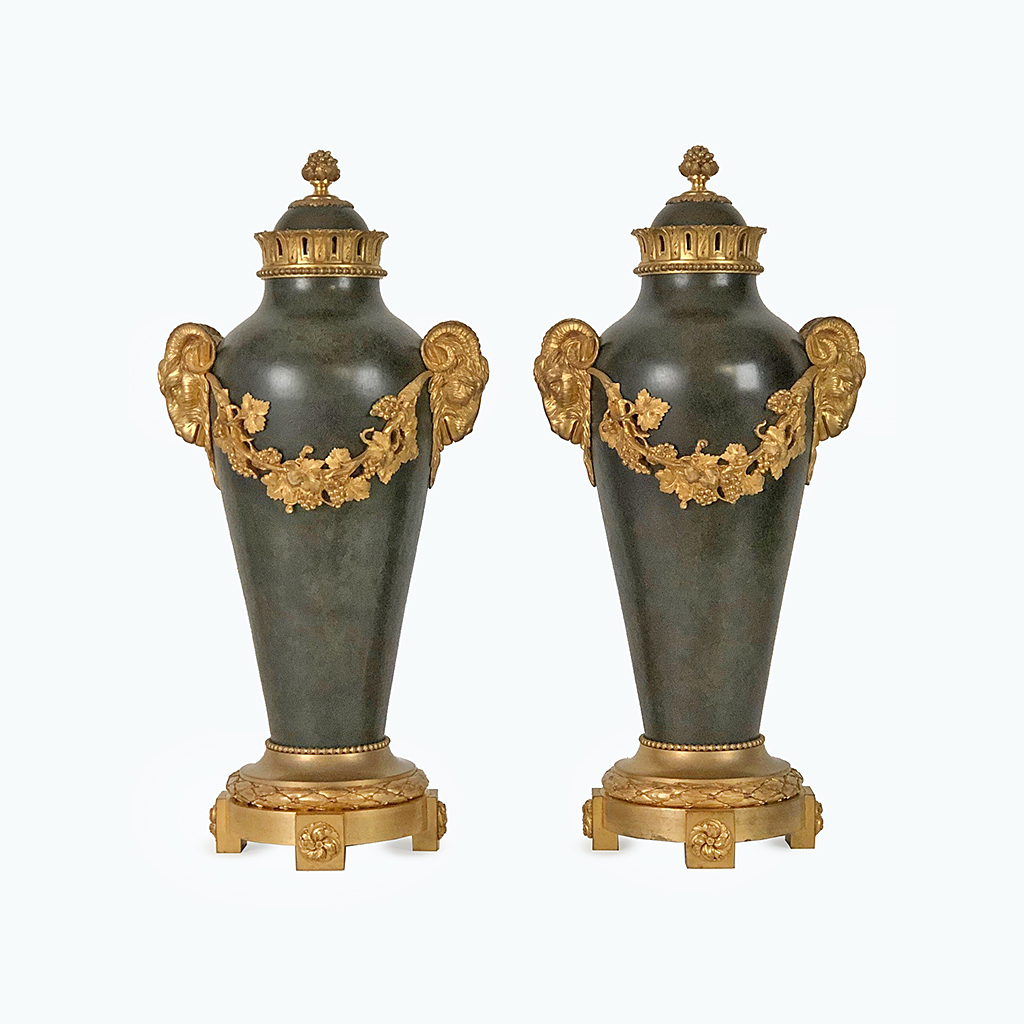 FRENCH BRONZE AND ORMOLU URN VERDI GREEN PATINATION WITH ORMOLU VINE SWAG AND RAM HEAD MOUNTS MAKERS STAMP THIERAUT PARIS 43 CM HIGH 20 CM WIDE 15 CM DEEP (X2)
