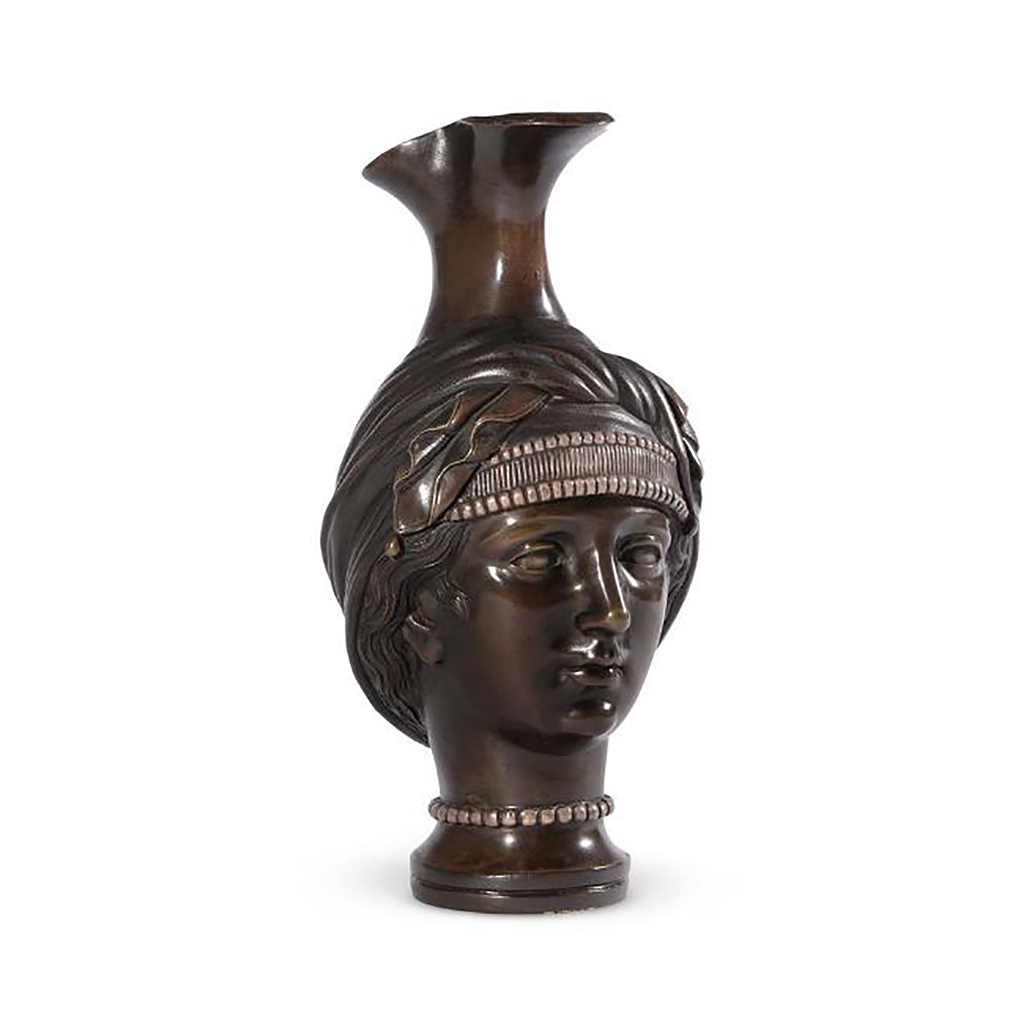 FRENCH BRONZE OINOCHOE WINE EWER IN THE ETRUSCAN STYLE LATE 19TH CENTURY IN THE FORM OF A FEMALE HEAD 21 CM HIGH
