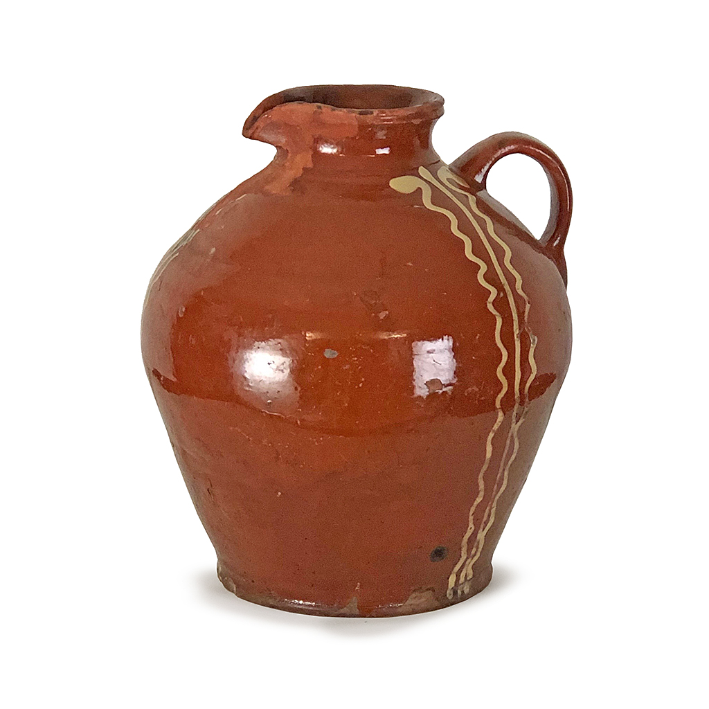 FRENCH BROWN GLAZED JUG WITH CREAM LINE DECORATION EARLY 19TH CENT 30 CM HIGH