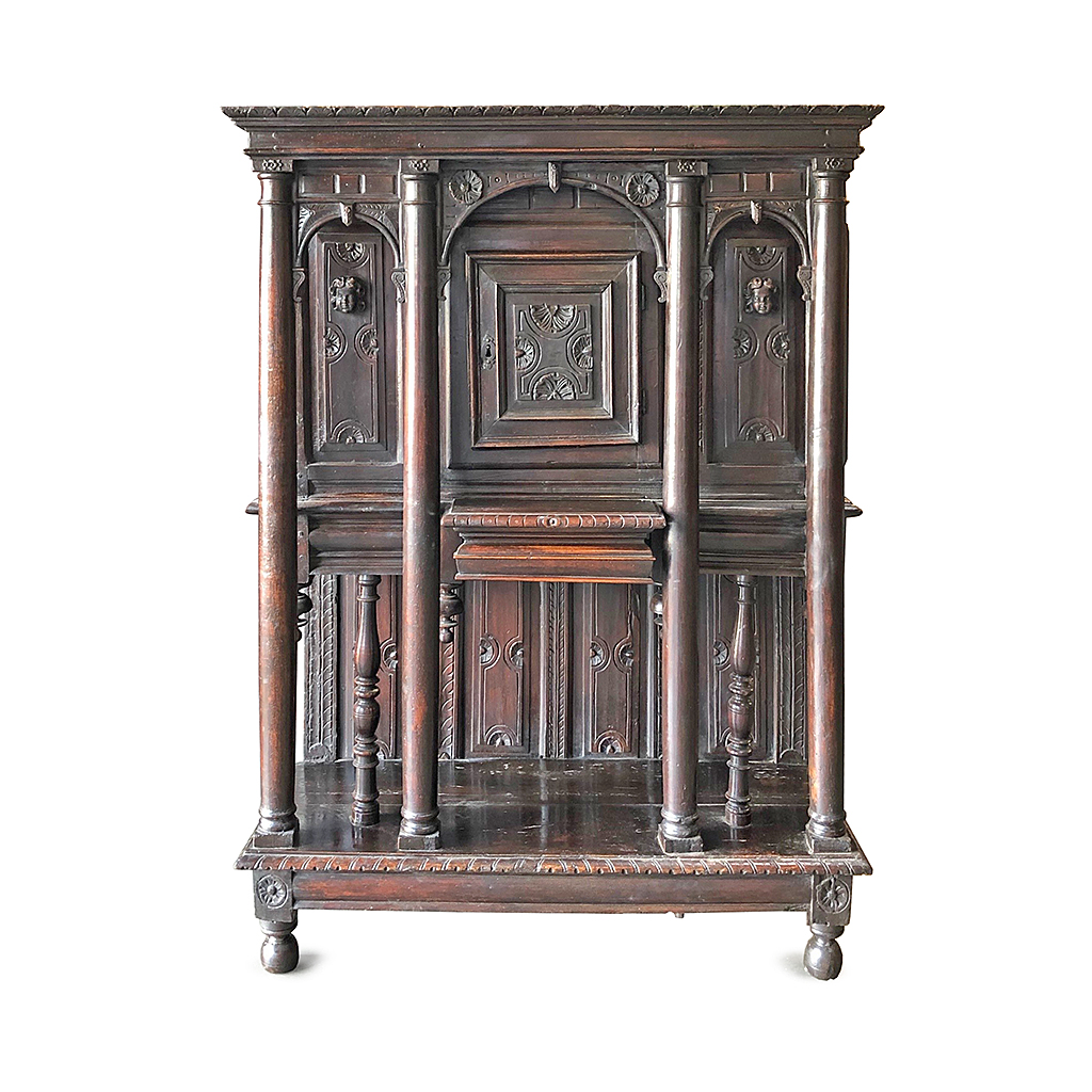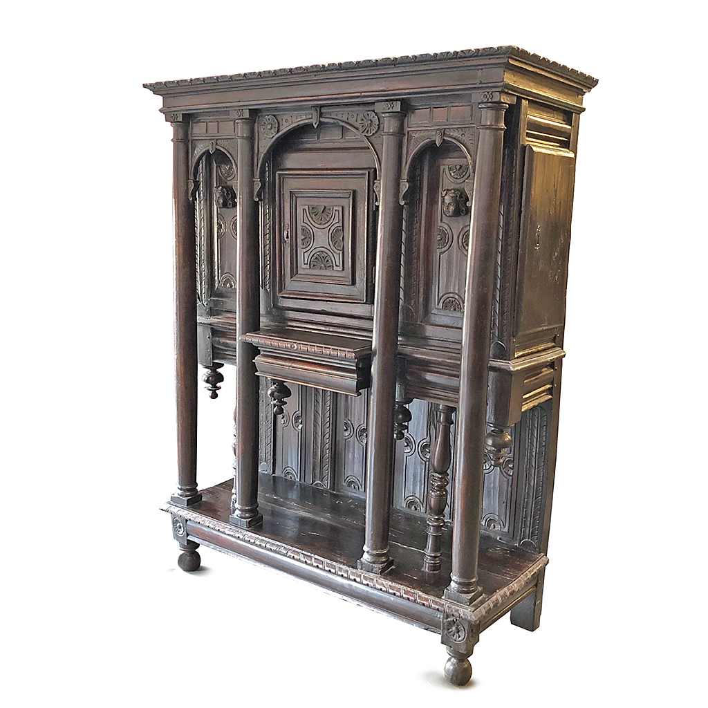 FRENCH CARVED DARK WALNUT CUPBOARD FOUR TURNED COLUMNS AND THREE DOORS CARVED WITH CHERUB HEADS A CUPBOARD TO EACH END HENRI II LATE 16TH CENT.