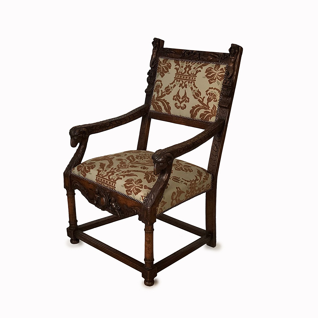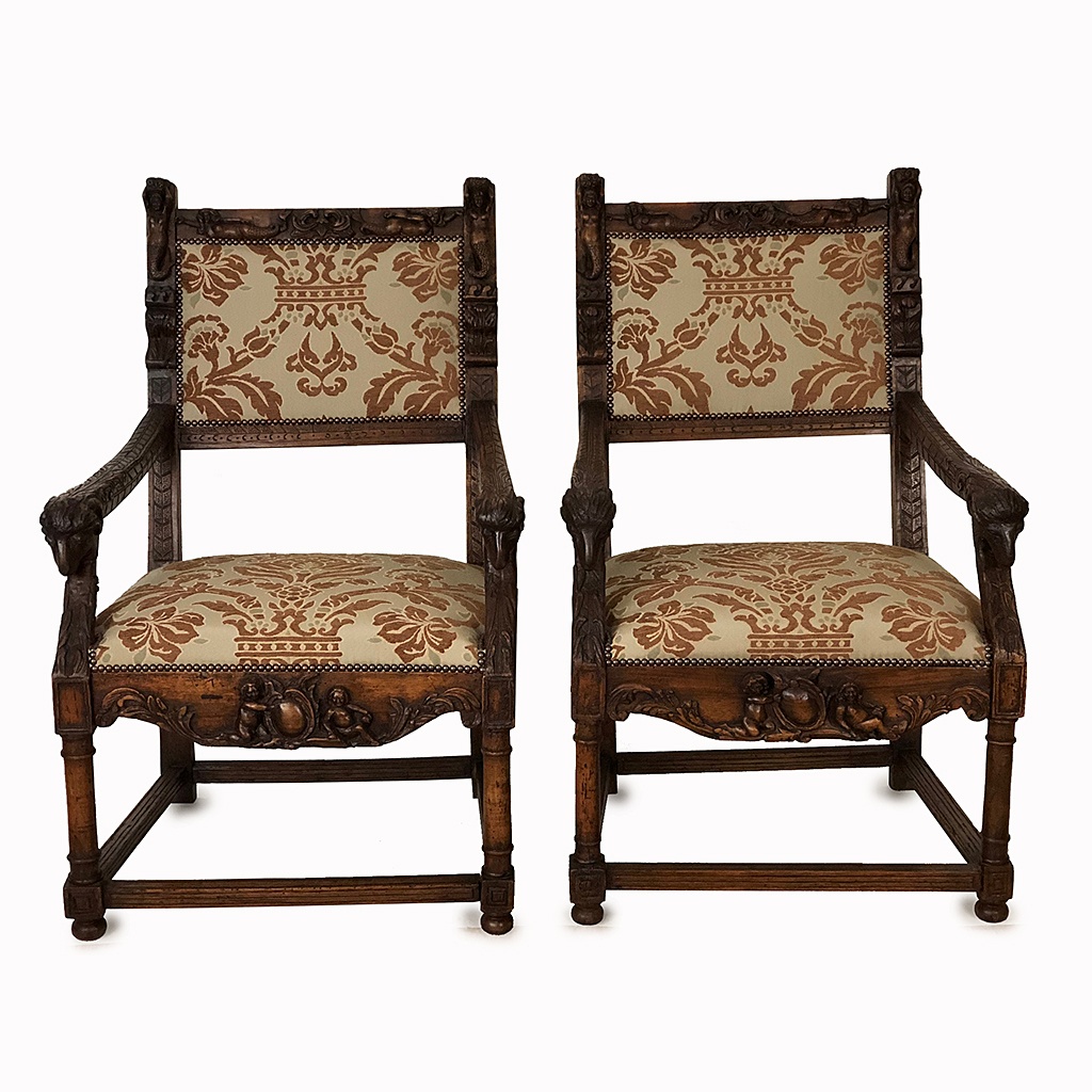 FRENCH CARVED WALNUT ARM CHAIR WITH RAMS HEAD ARMS AND MERMAID RELIEF BROWN AND CREAM UPHOLSTERY HENRI II CIRCA 1560 104 CM HIGH 67 CM WIDE 64 CM DEEP (X2)