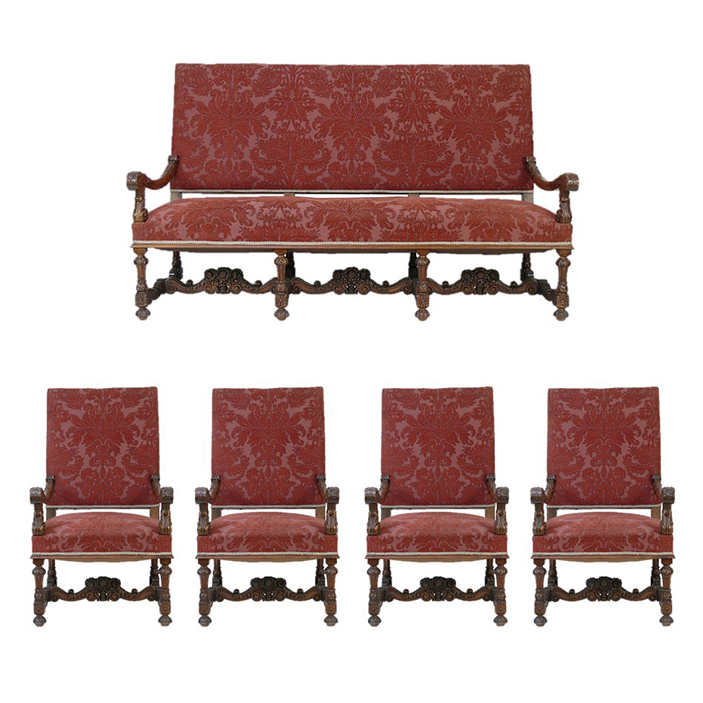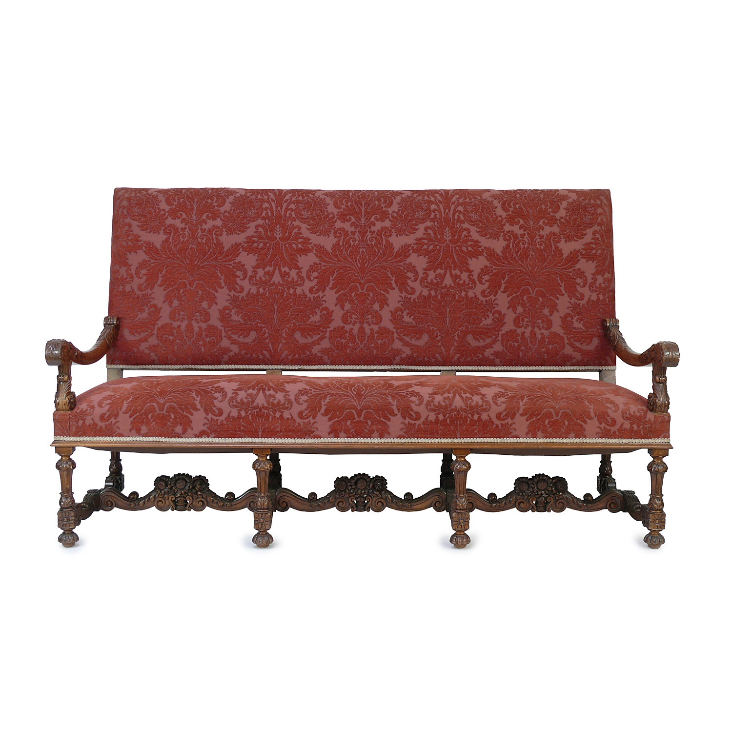FRENCH CARVED WALNUT SETTEE / SOFA 18TH CENT STYLE WITH CLARET RED GENOA CUT VELVET UPHOLSTERY 113 CM HIGH 195 CM WIDE