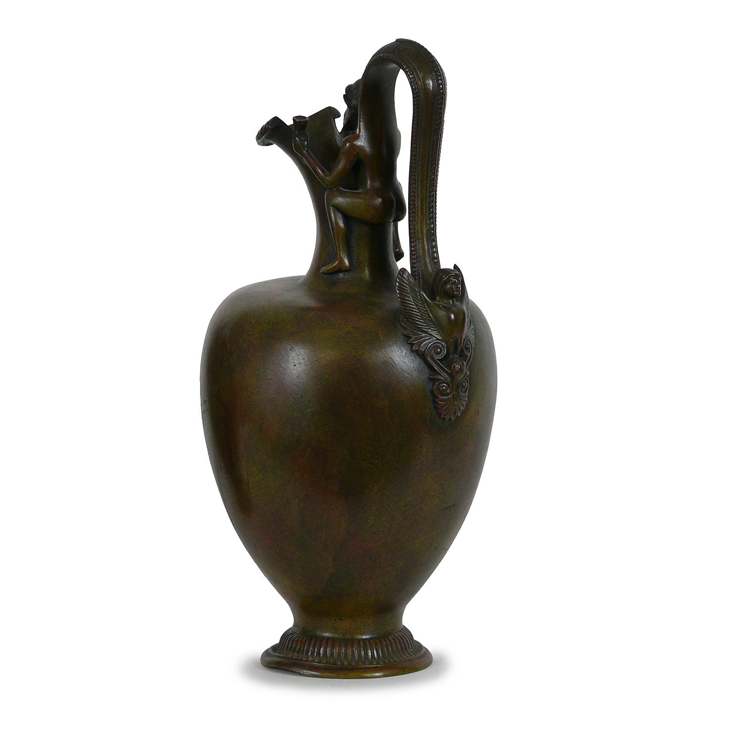 FRENCH CLASSICAL BRONZE EWER / URN WITH FIGURE SEATED ASTRIDE THE SPOUT SMALL PARIS FOUNDRY SEAL TO BASE 32 CM HIGH 15 CM DIAM (X2)