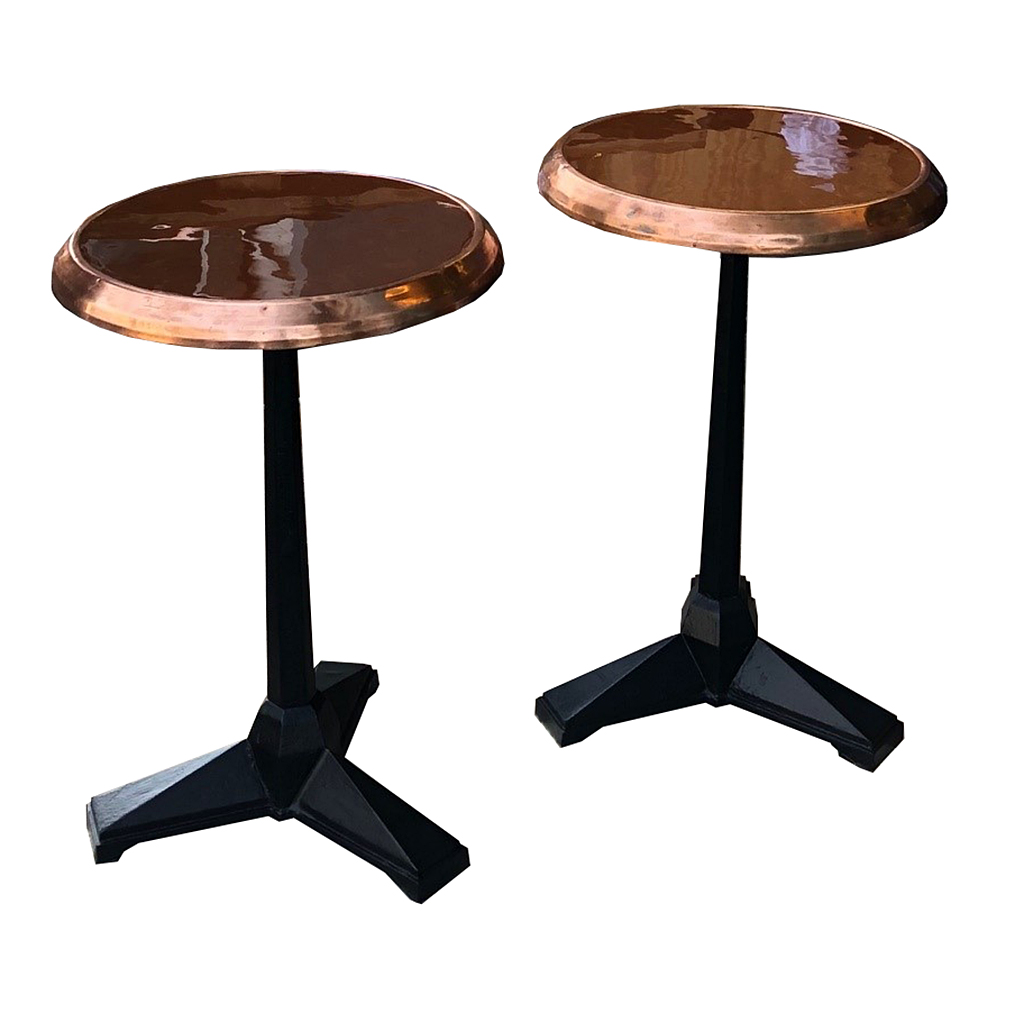 FRENCH COPPER EDGE CIRCULAR CAFE TABLE WITH AMBER FAUX TORTOISESHELL TOP BLACK CAST IRON BASE CIRCA 1920 74 CM HIGH X 50 CM DIAMTER (X6)