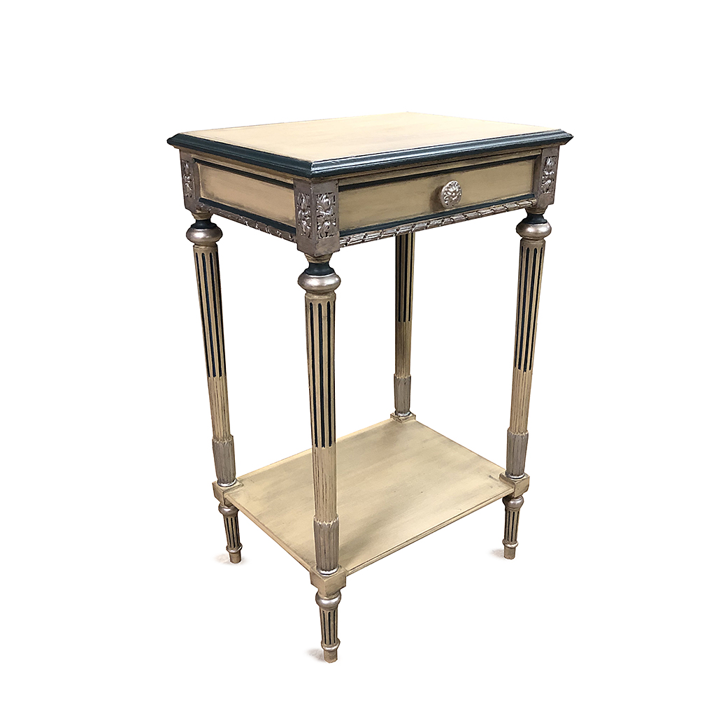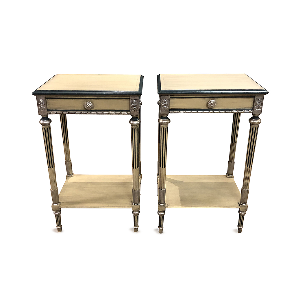 FRENCH CREAM AND SILVER BEDSIDE TABLE TWO TIER SINGLE DRAWER 2'5/i HIGH 1'6/i WIDE 1'1/i DEEP 74 CM X 46 CM X 33 CM (X2)