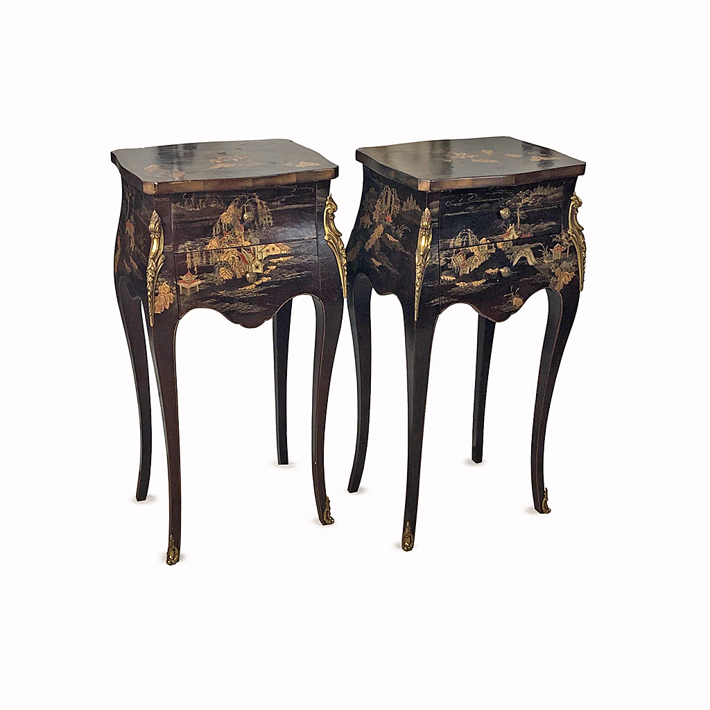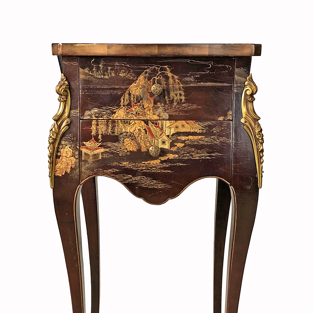 FRENCH DECORATED CHINOISERIE LACQUER BEDSIDE TABLE WITH ORMOLU MOUNTS HAENTGES FRERES PARIS LATE 19TH CENT 72 CM HIGH 36 CM WIDE 29 CM DEEP (X2)