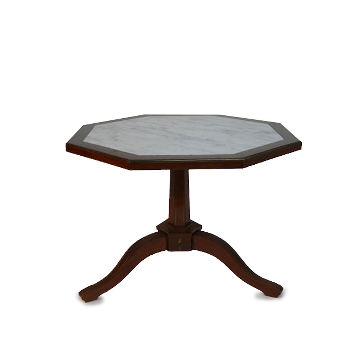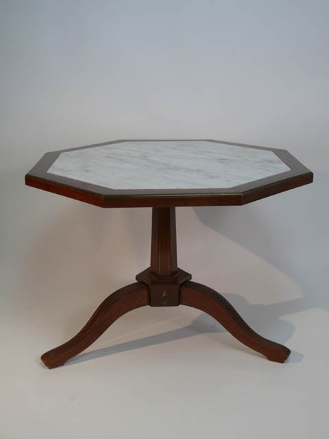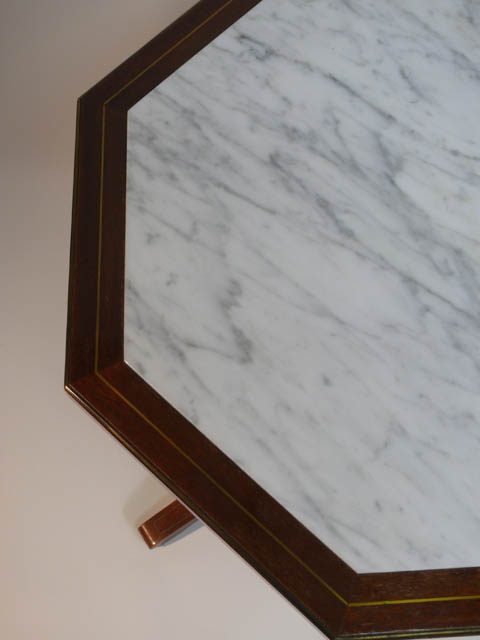 FRENCH DIRECTOIRE STYLE LOW TABLE OCTAGONAL PALE MAHOGANY BRASS INLAID WITH INSET WHITE CARERRA MARBLE TOP 50 CM HIGH X 70 CM WIDE X 70 CM DEEP (X2)