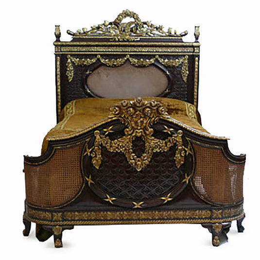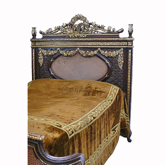 FRENCH DOUBLE BED ORNATE CARVED MAHOGANY AND PARCEL GILT RIBBONS AND SWAGS WITH OVAL RATTAN PANEL INC. MATTRESS AND SPRUNG BASE 4'6/i WIDE