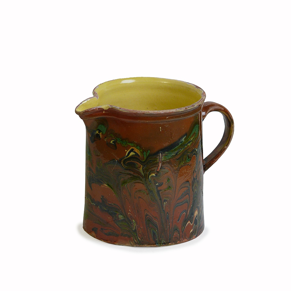 FRENCH EARTHENWARE JUG WITH GREEN AND BROWN MARBLED GLAZE SAVOIE REGION 18 CM HIGH