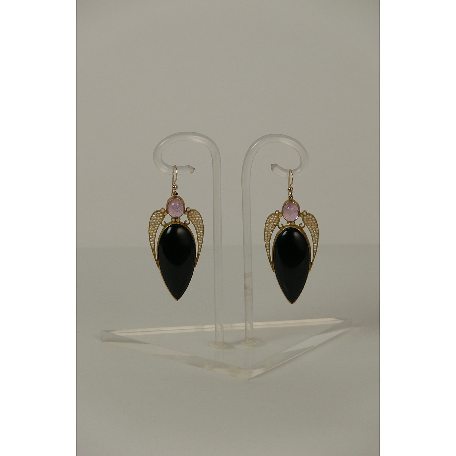 FRENCH EDWARDIAN EARRINGS WITH PEARL ONYX AND ROSE QUARTZ DROPS