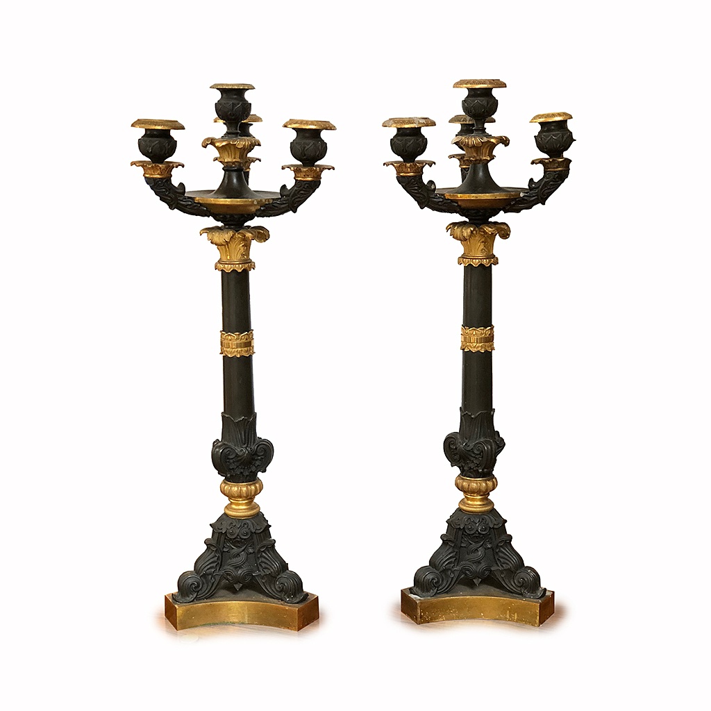 FRENCH EMPIRE BRONZE AND ORMOLU FOUR LIGHT CANDELABRA WITH ORMOLU TRI-CORNER BASE 63 CM HIGH 23 CM WIDE (X2)