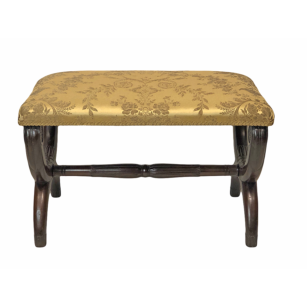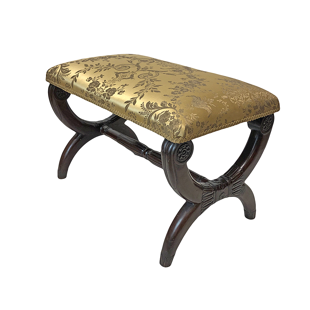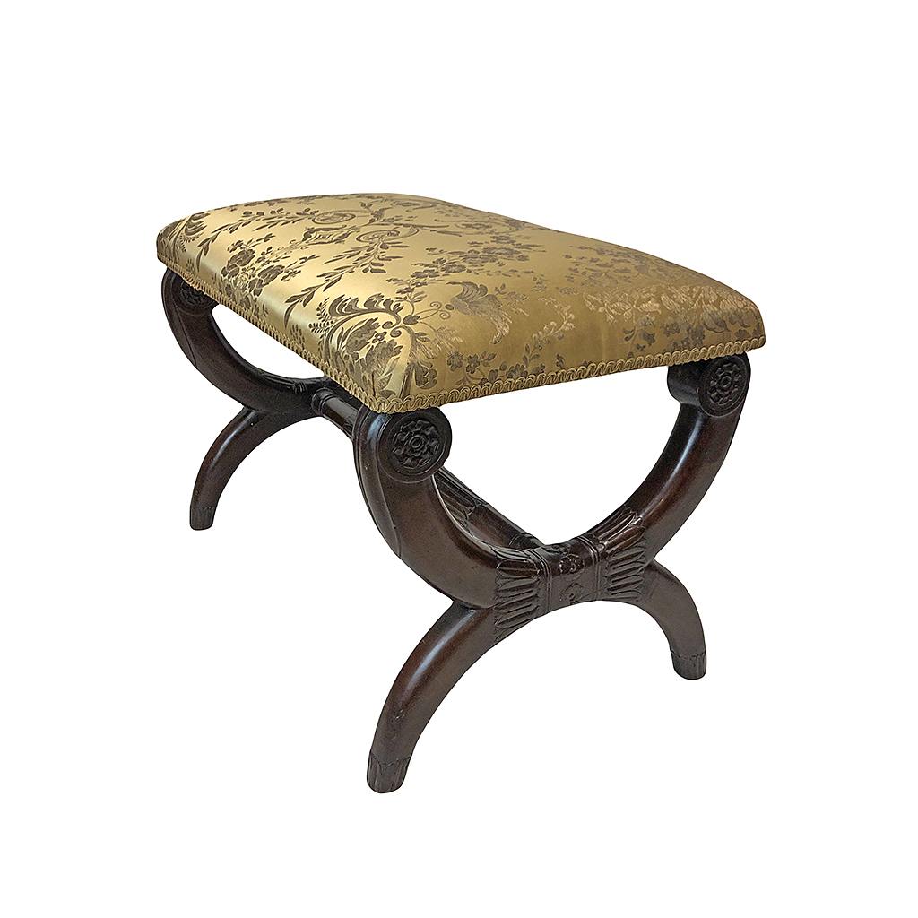 FRENCH EMPIRE STOOL CARVED MAHOGANY X FRAME WITH STRETCHER AND GOLD FLORAL SILK UPHOLSTERED SEAT 51 CM HIGH 82 CM LONG 47 CM DEEP