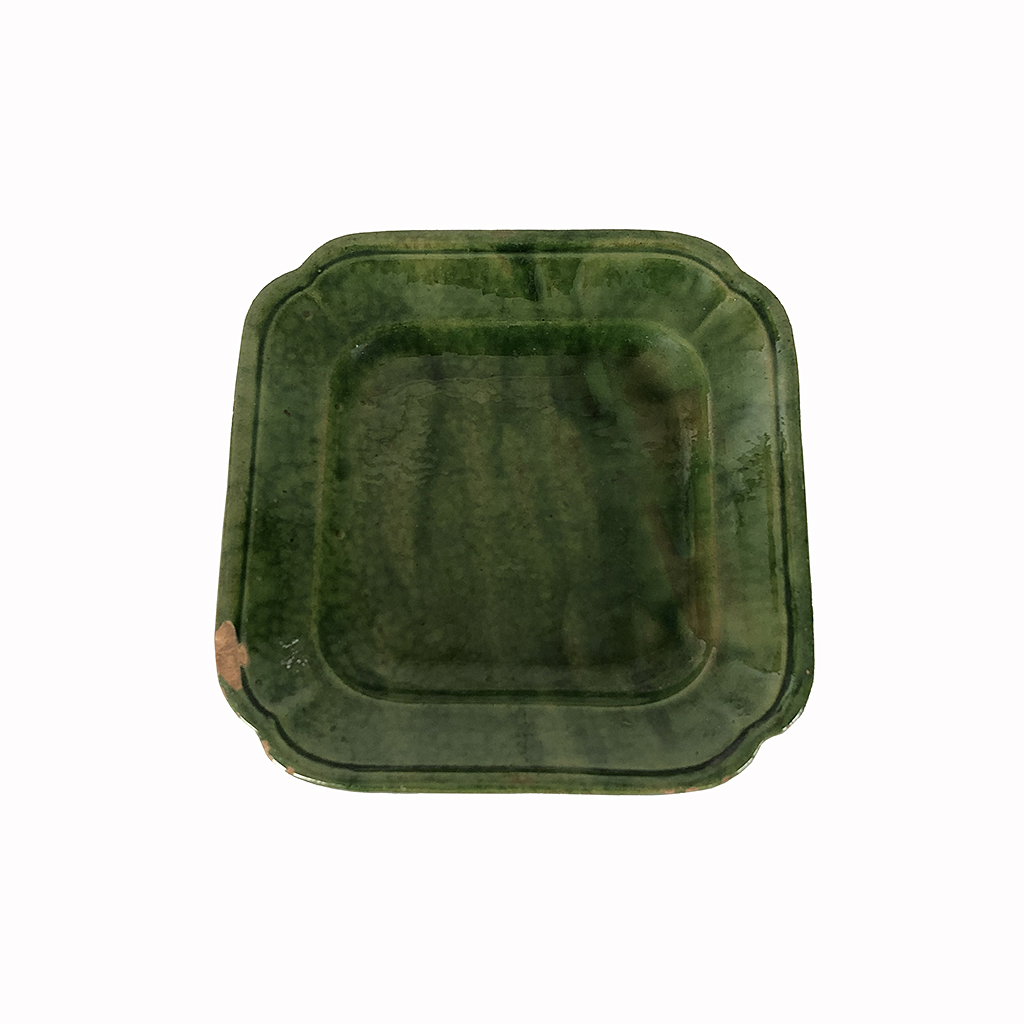 FRENCH GREEN GLAZED SQUARE PLATE WITH SHAPED CORNERS 23 CM X 23 CM