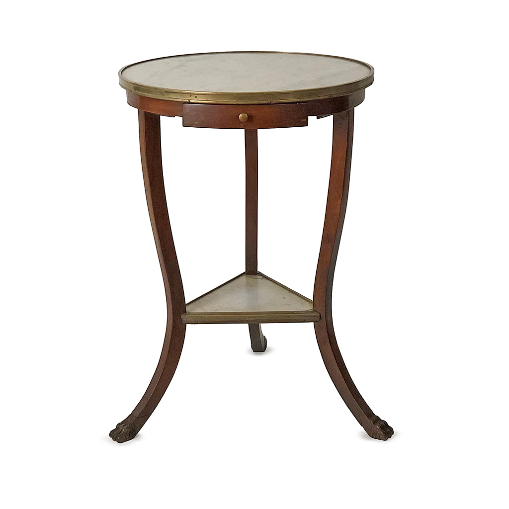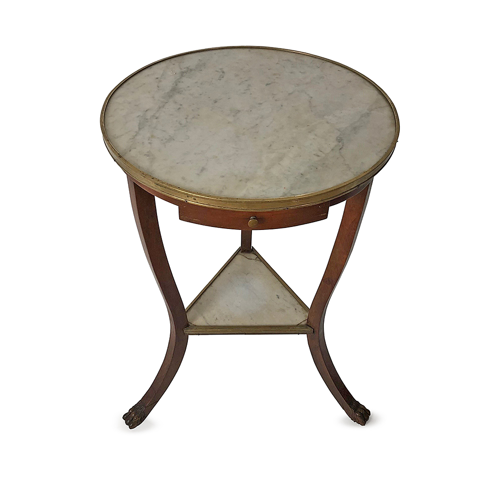 FRENCH GUERIDON / OCCASIONAL TABLE CIRCULAR WITH MAHOGANY SABRE LEGS AND A WHITE CARERRA MARBLE TOP DIRECTIORE CIRCA 1810 73 CM HIGH 51 CM DIAM
