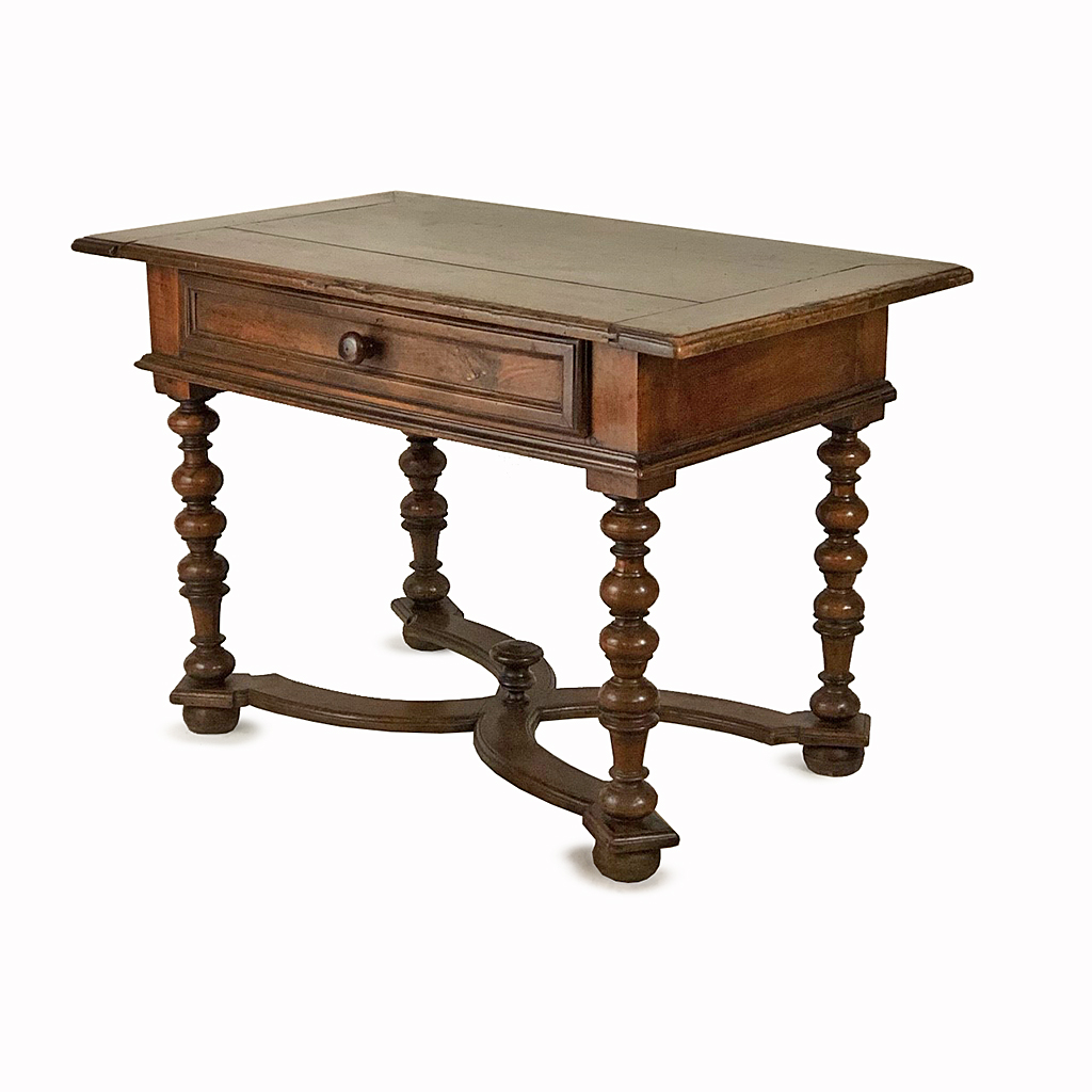 FRENCH LOUIS XIII WALNUT SIDE TABLE WITH SINGLE DRAWER TURNED LEGS AND SHAPED CROSS STRETCHERS 71 CM HIGH 105 CM WIDE 64 CM DEEP