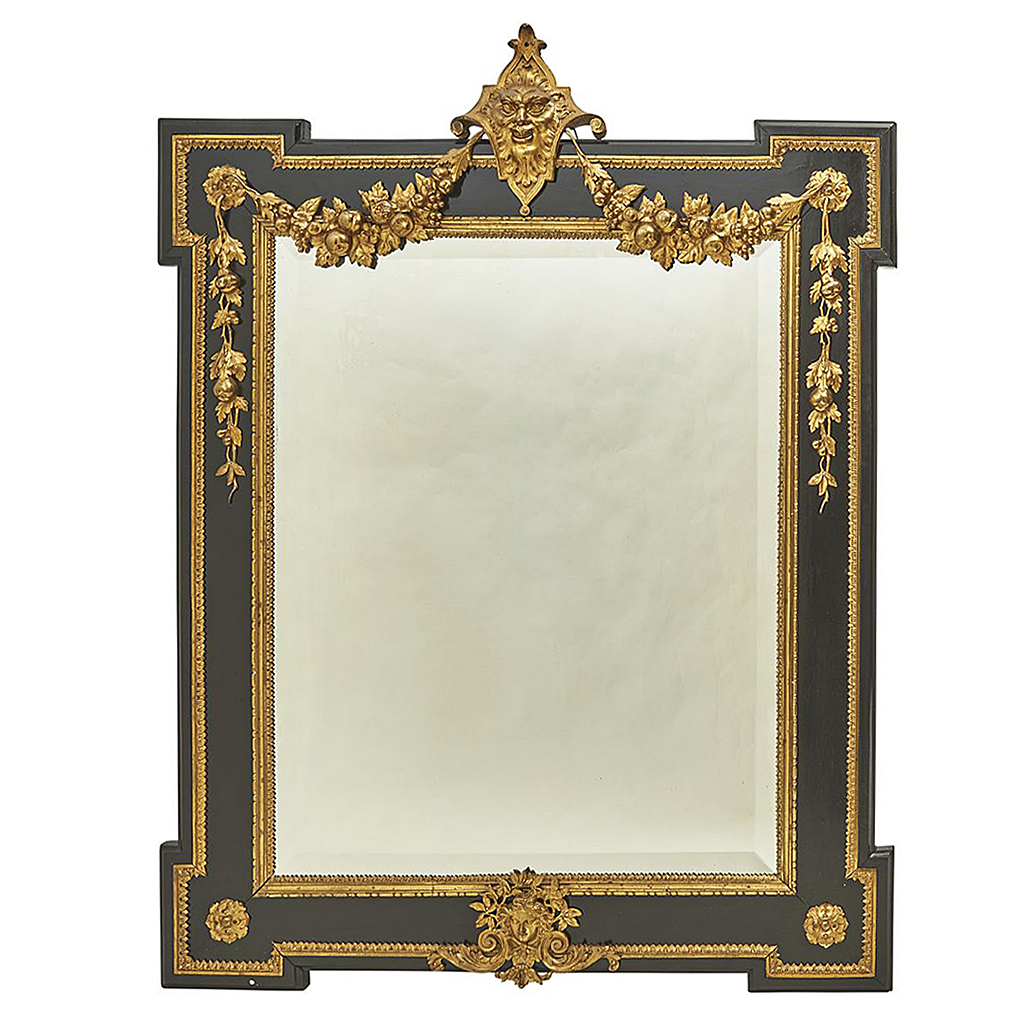 FRENCH LOUIS XIV STYLE EBONISED MIRROR BROKEN CORNER FRAME WITH GILT BRONZE GARLAND MOUNTS AND BEVELLED GLASS 136 CM HIGH 104 CM WIDE