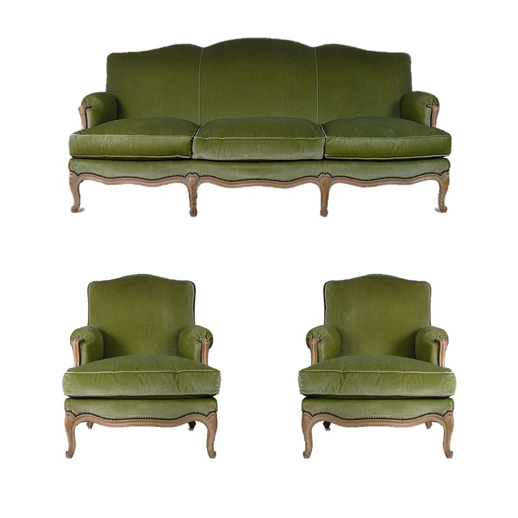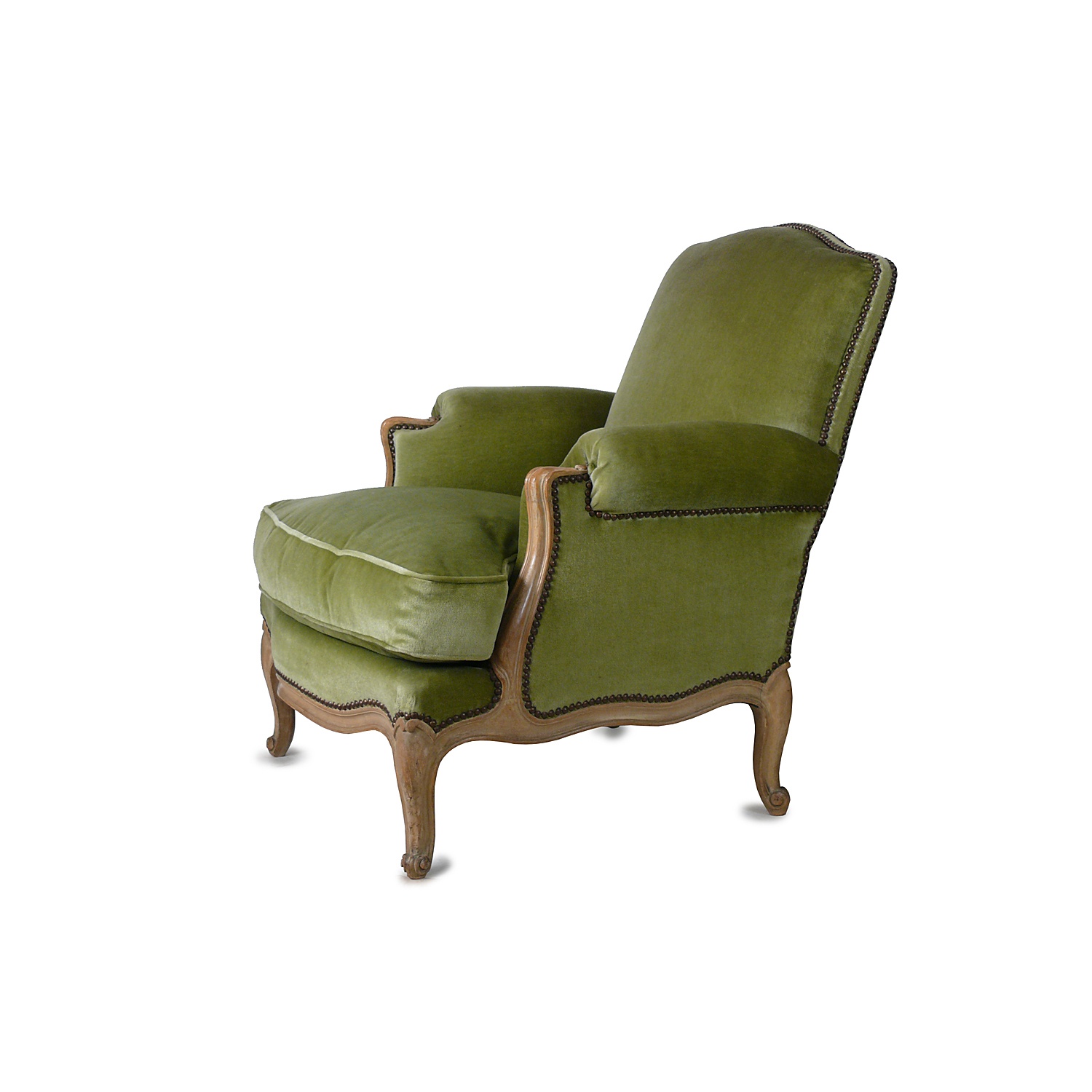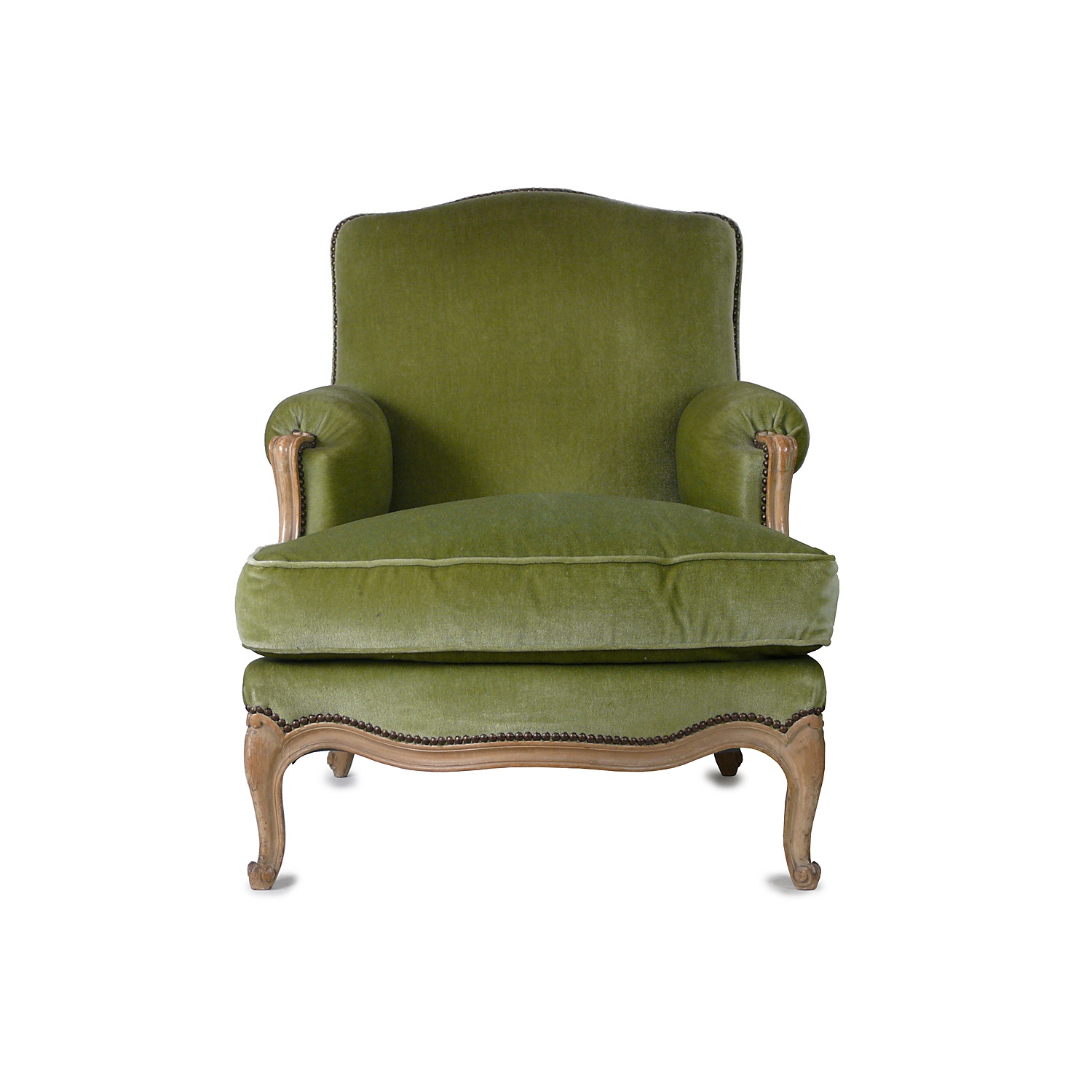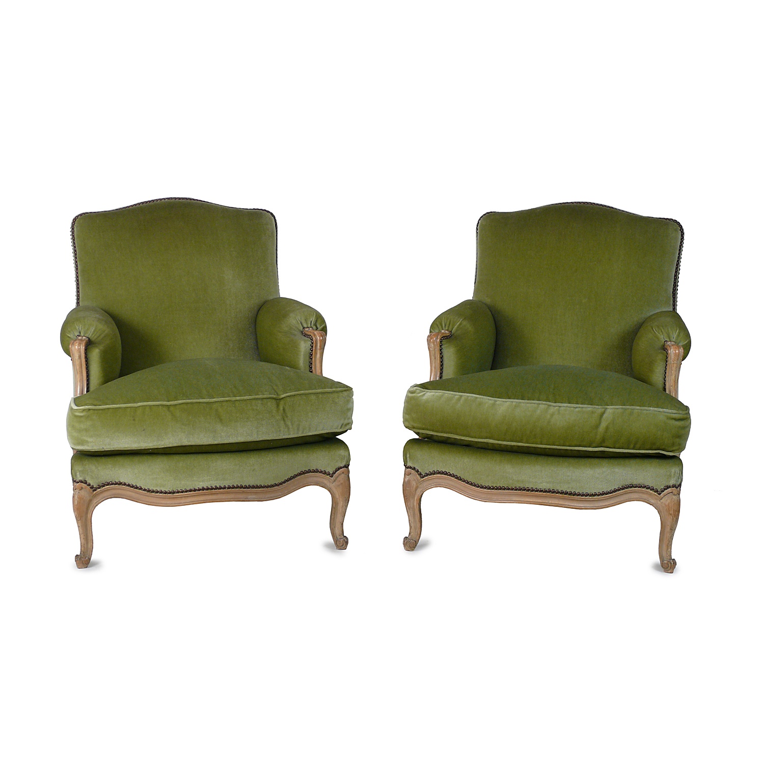 FRENCH LOUIS XV STYLE ARMCHAIR CARVED LIGHT BEECH FRAME WITH CELADON GREEN VELVET UPHOLSTERY AND FITTED CUSHION 86 CM HIGH 74 CM WIDE 87 CM DEEP (X2)