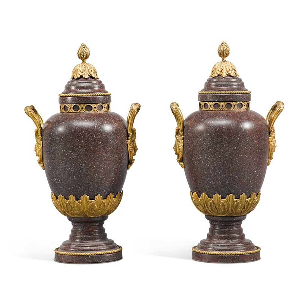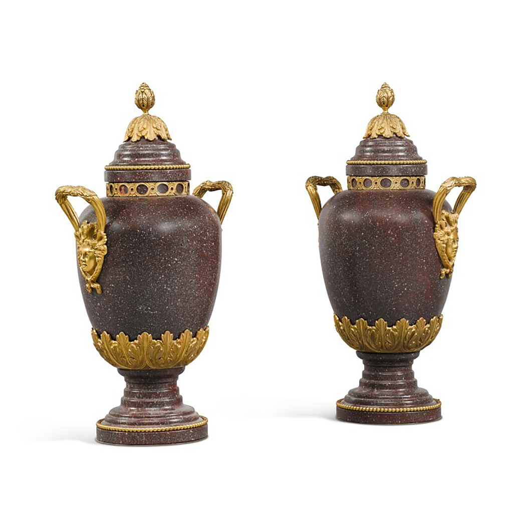 FRENCH LOUIS XV STYLE PORPHYRY MARBLE VASE URN AND LID WITH ORMOLU MOUNTS SELENE THE TITAN GODDESS OF THE MOON AND ACANTHUS LEAVES 61 CM HIGH 32 CM WIDE 24 CM DEEP (X2)