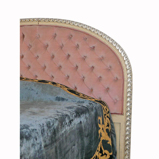 FRENCH LOUIS XVI STYLE BED SILVER GILT WITH DEEP BUTTONED PINK VELVET PANEL PLUS MATTRESS 4'6/i WIDE