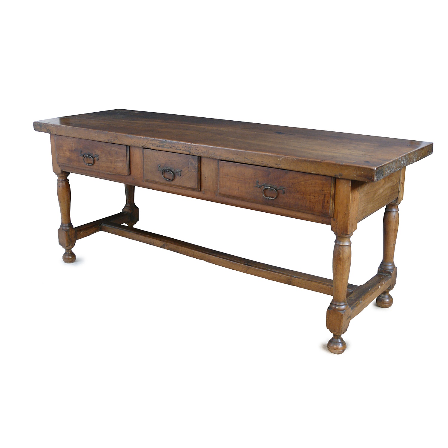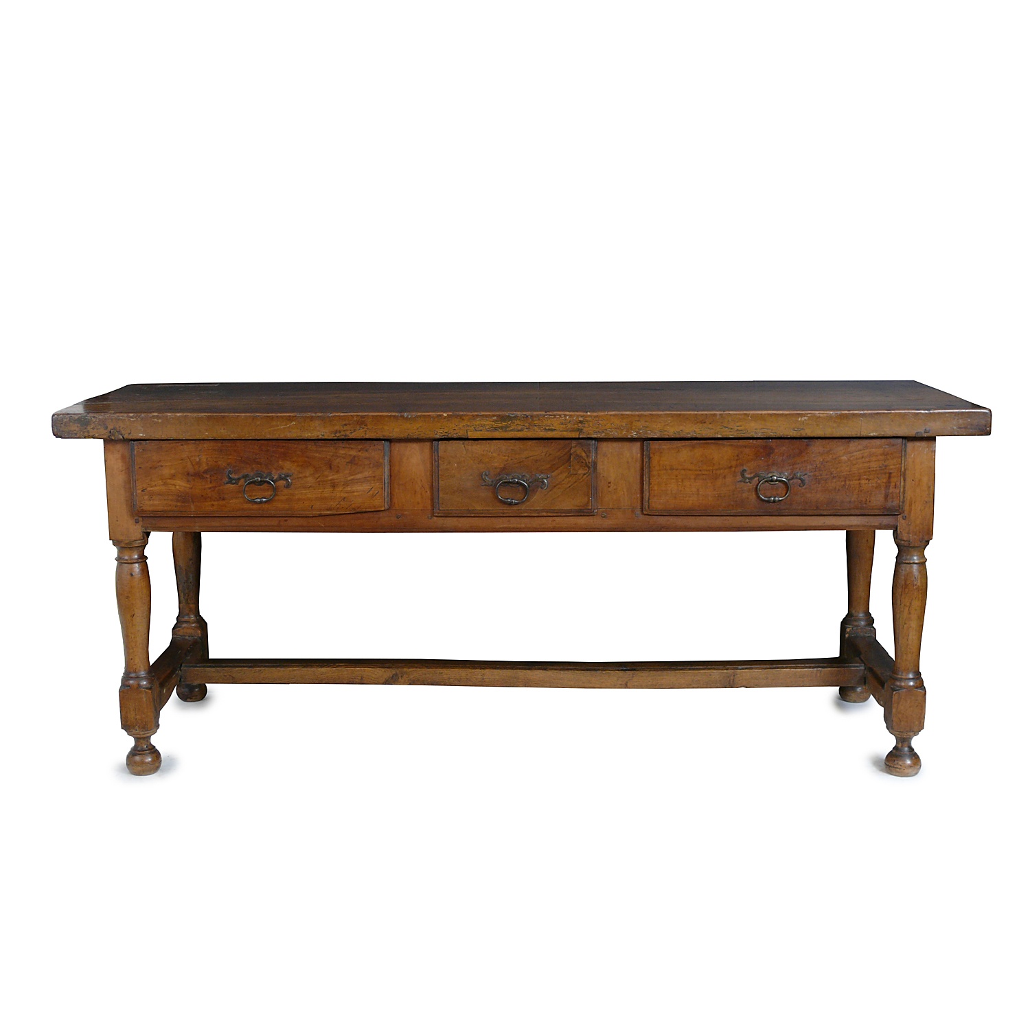 FRENCH LOW WALNUT SIDE TABLE / BUFFET WITH TURNED LEGS AND CENTRAL STRETCHER PLUS THREE DRAWERS CIRCA 1780 69 CM HIGH 172 CM LONG 58 CM DEEP
