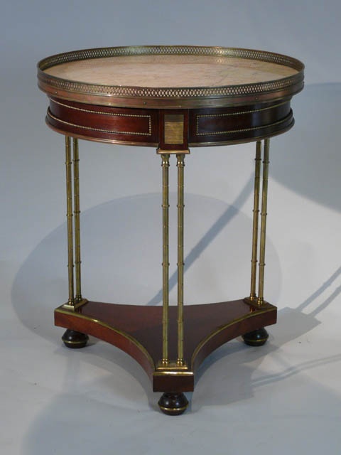 FRENCH MAHOGANY AND ORMOLU CIRCULAR OCCASIONAL TABLE AFTER WEISWEILER WITH TWIN LEG SUPPORTS AMBER BROCATELLE MARBLE TOP AND GALLERY EDGE 68 CM HIGH 55 CM DIAM (X2)