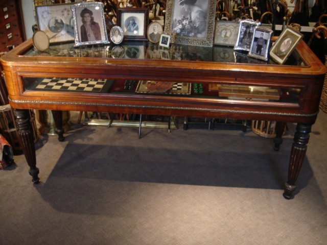 FRENCH MAHOGANY VITRINE SHOWCASE TABLE WITH GLASS TOP AND ORMOLU BEADING 67.5/iL X 26/iD X 33/iH / 171 CM LONG X 65 CM DEEP X 83 CM HIGH // 67.5/iL X 26/iD X 33/iH / 171 CM LONG X 65 CM DEEP X 83 CM HIGH