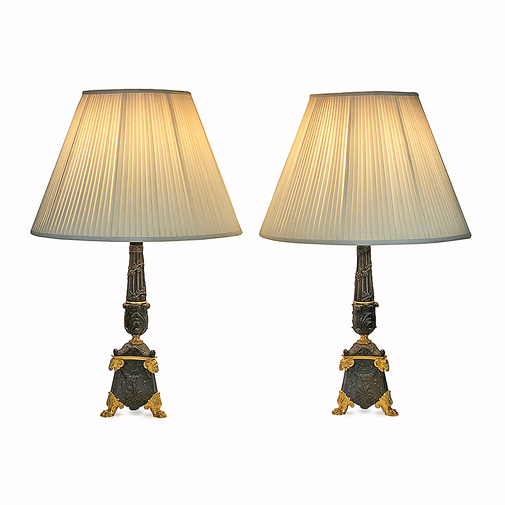 FRENCH NAPOLEON III BRONZE AND ORMOLU TABLE LAMP WITH RAM HEAD TRI-CORNER BASE 46 CM HIGH (X2) (MEDIUM SHADE LIGS10007 NOT INCLUDED)