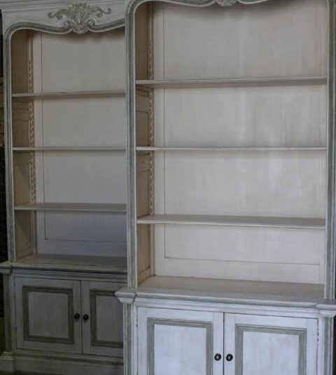 FRENCH OPEN BOOKCASE LOUIS XV STYLE CREAM AND FRENCH GREY PAINTED WITH CUPBOARD BASE 250 CM HIGH 126 WIDE SHELF DEPTH 35-45 CM (X2)