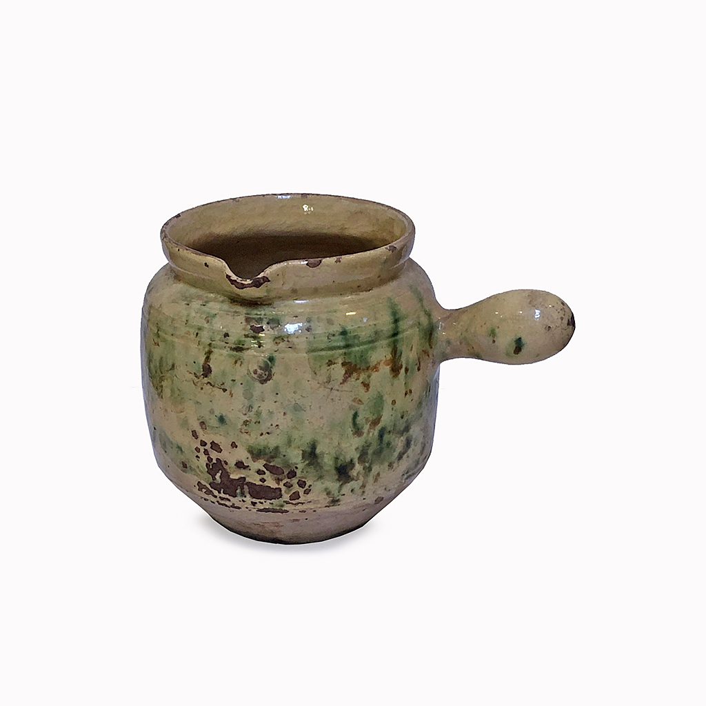 FRENCH PALE GREEN SPECLE GLAZED JUG WITH SIDE HANDLE 13 CM HIGH