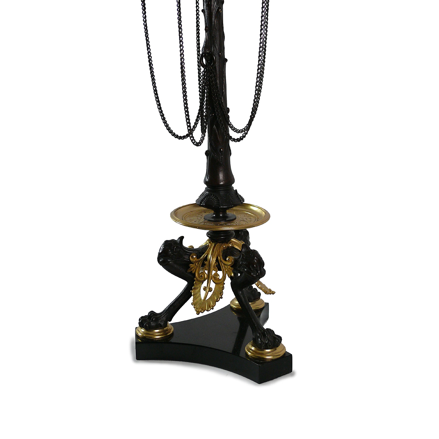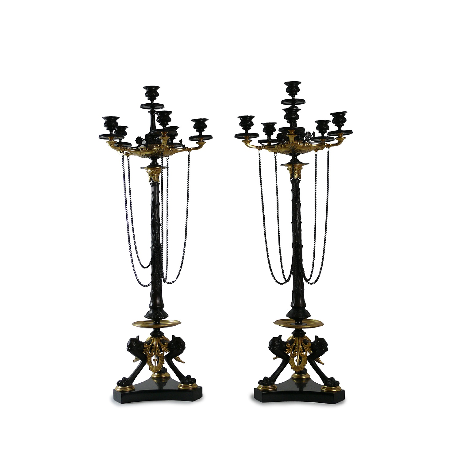 FRENCH PATINATED AND GILT BRONZE SIX LIGHT CANDELABRA CIRCA1890 ON SLATE PLINTH 91 CM HIGH 31 CM WIDE (X2)