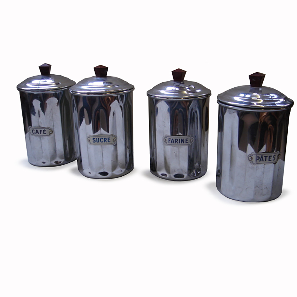 FRENCH POLISHED TIN CIRCULAR STORAGE JAR AND LID WITH SQUARE BROWN BAKELITE KNOB TOP (X4)