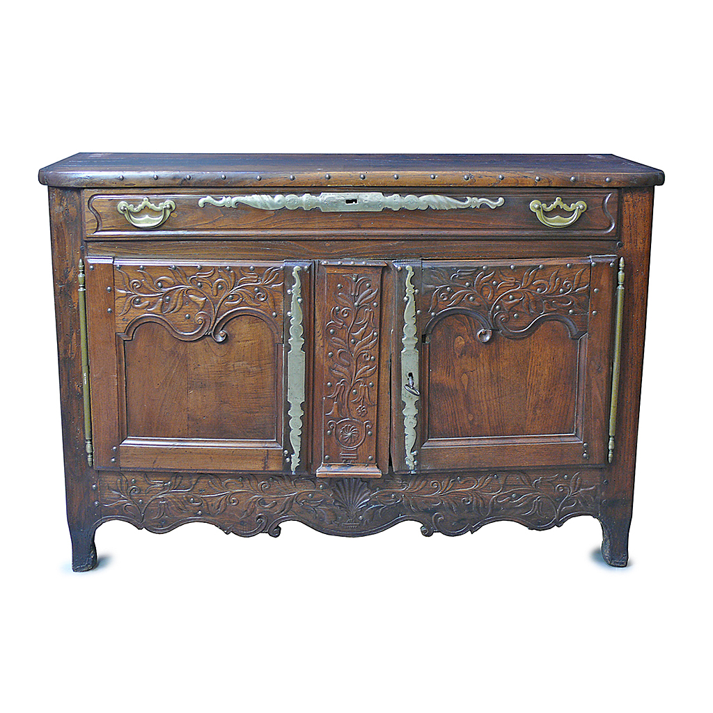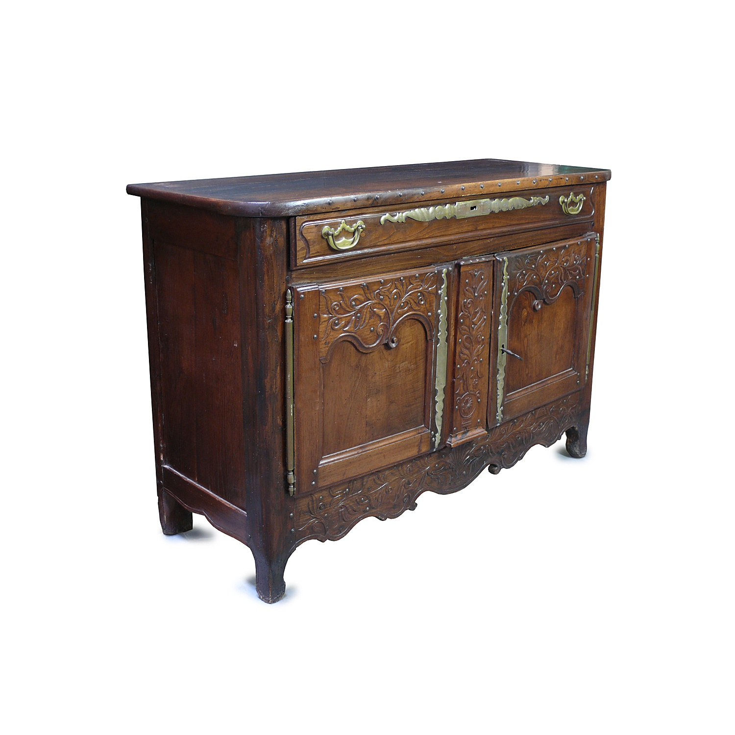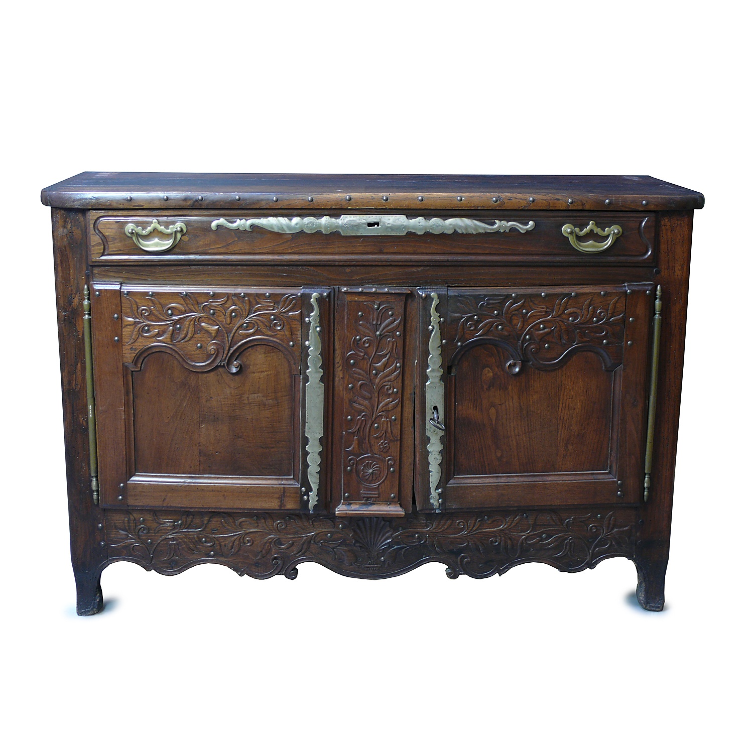 FRENCH PROVINCIAL BUFFET CUPBOARD CARVED WITH BRASS MOUNTS ESCUTCHEONS AND STUDS BRETTON 18TH CENT 96 CM HIGH 141 CM WIDE 52 CM DEEP