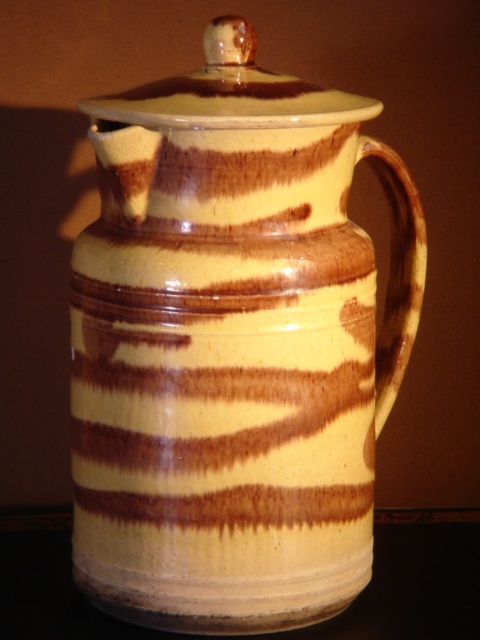 FRENCH PROVINCIAL LARGE YELLOW AND BROWN SLIP GLAZED JUG WITH LID 11/i HIGH 28 CM