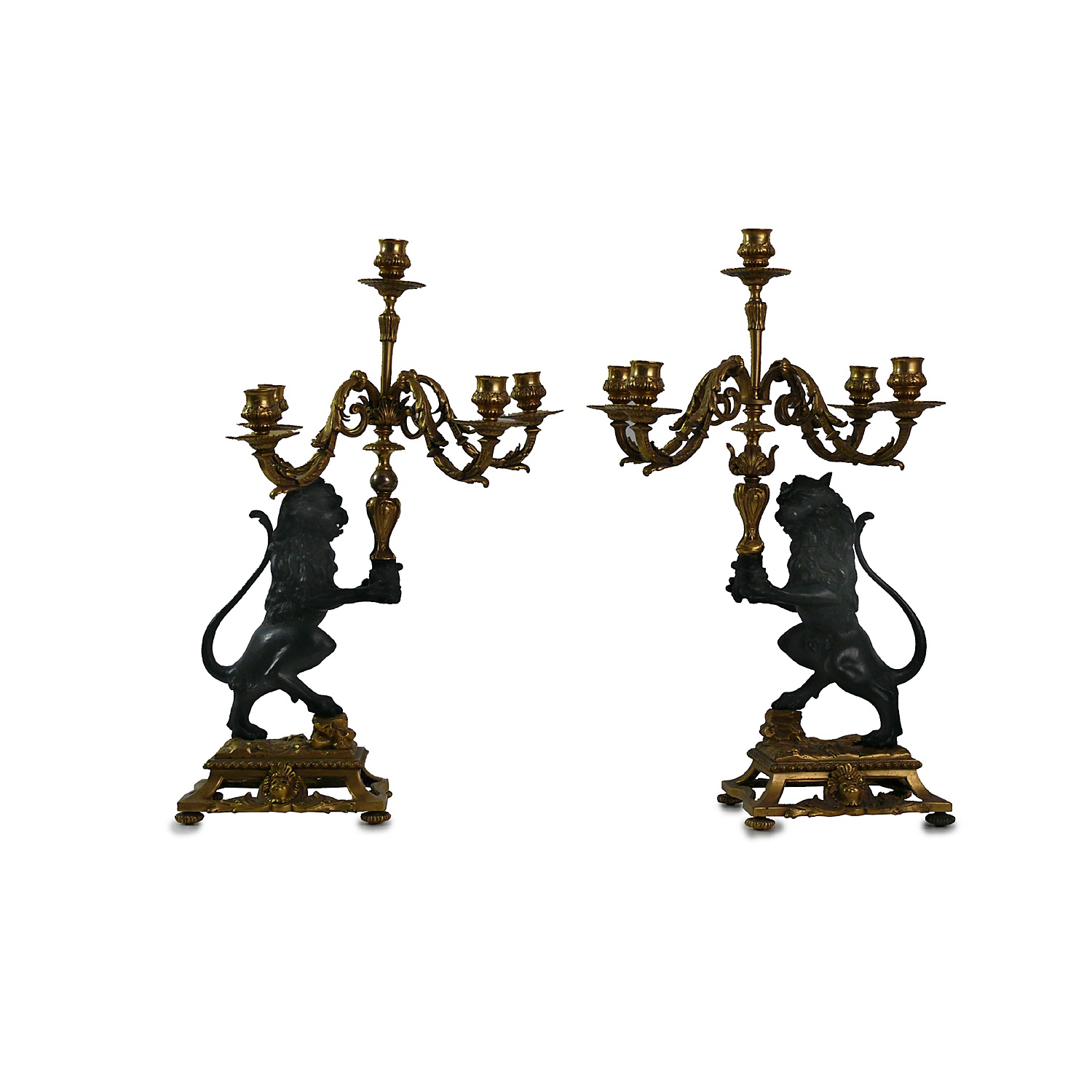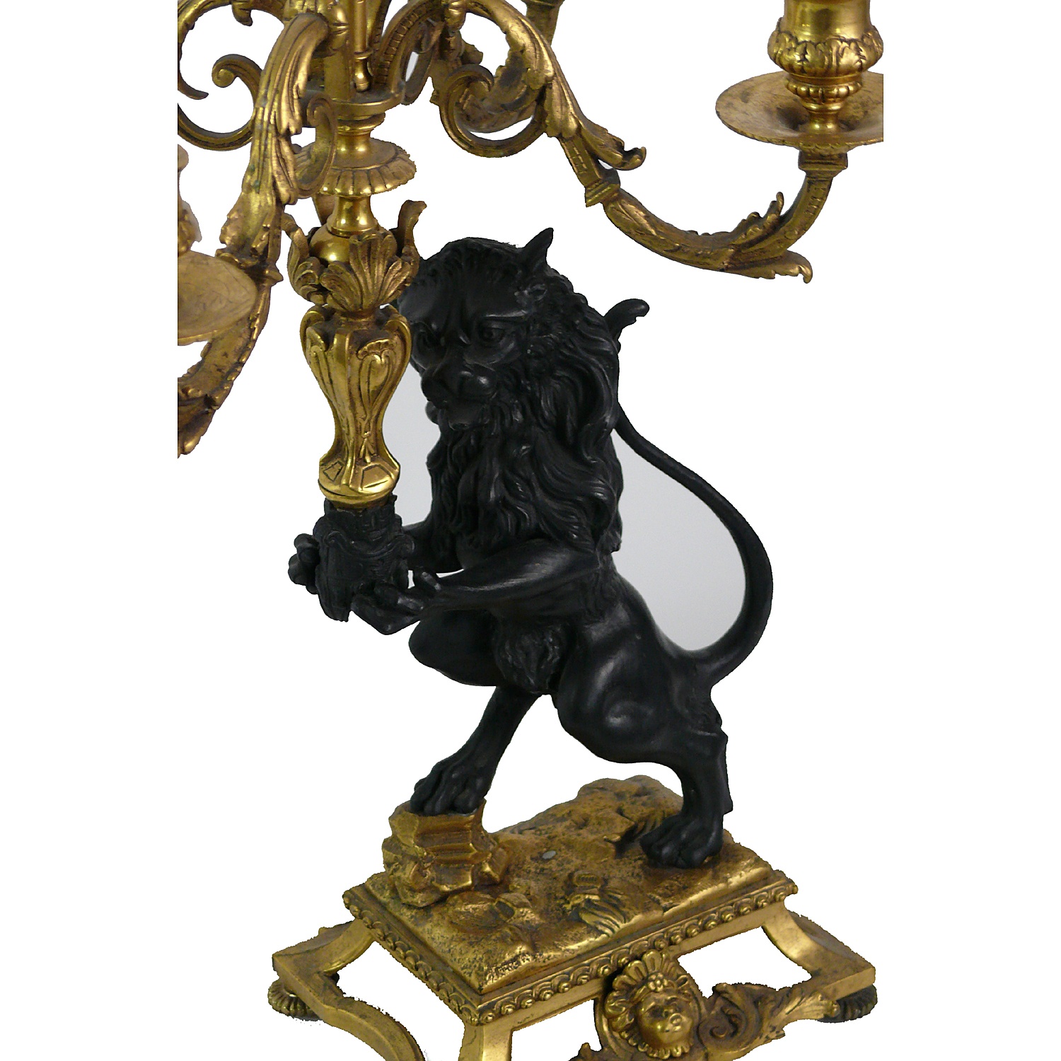 FRENCH REGENCE STYLE CANDELABRA BRONZE LION WITH ORMOLU FIVE LIGHT AND BASE 54 CM HIGH 32 CM WIDE (X2)