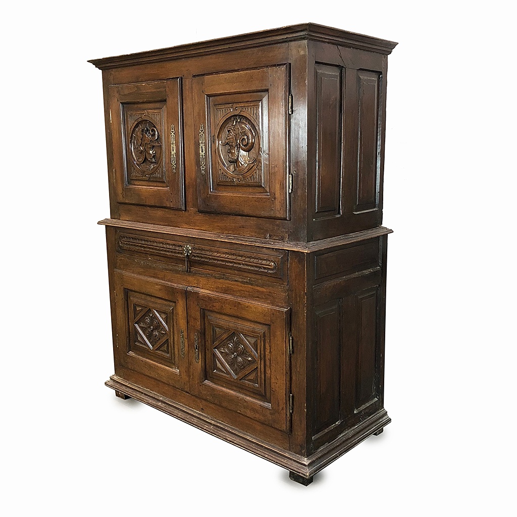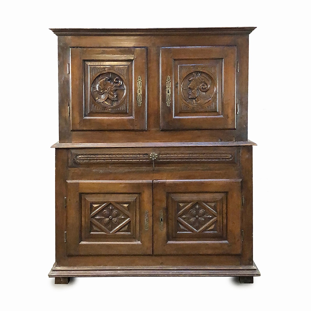 FRENCH RENAISSANCE CUPBOARD IN TWO PARTS THE UPPER DOORS CARVED IN REIEF WITH PORTRAITS CIRCA 1530 176 CM HIGH 140 CM WIDE 64 CM DEEP