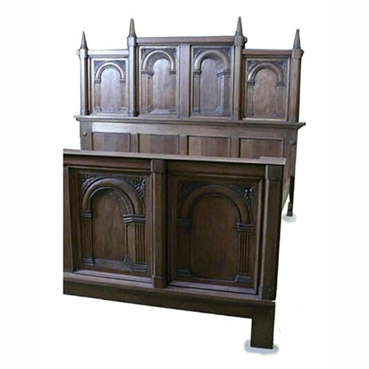 FRENCH RENAISSANCE STYLE OAK DOUBLE BED CARVED WITH PERSPECTIVE ARCHES COMPLETE WITH MATTRESS 6' WIDE