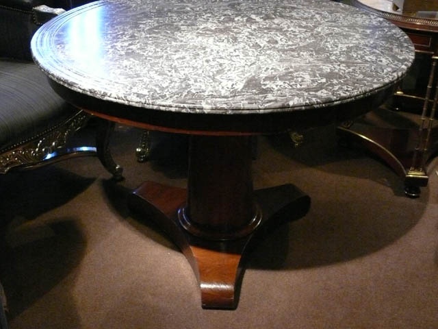 FRENCH SIMPLE MAHOGANY PEDESTAL CENTRE TABLE GREY MARBLE TOP 2'3/i HIGH 3'3/i DIAM 69 CM X 96 CM