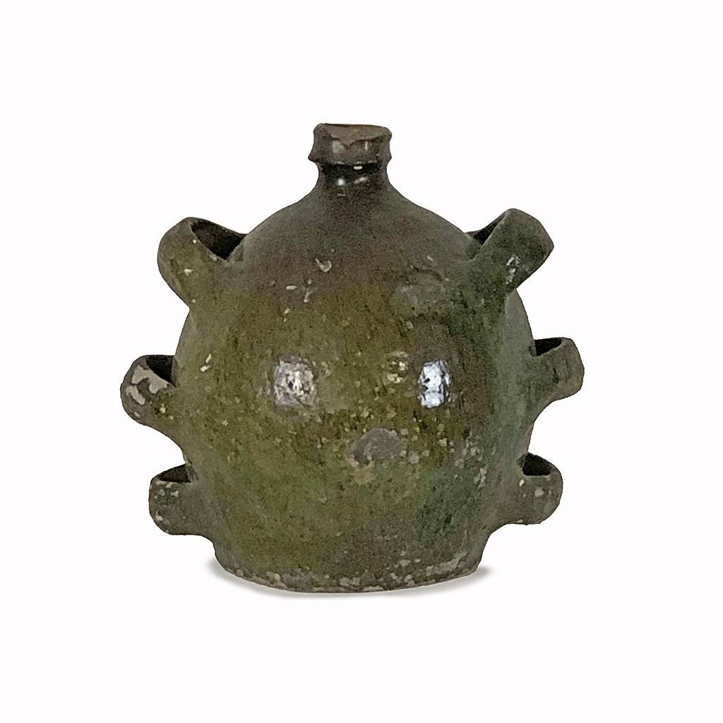 FRENCH SMALL GREEN GLAZED CONSCIENCE POT / EWER WITH SIX LOOP HANDLES 19TH CENT 27 CM HIGH