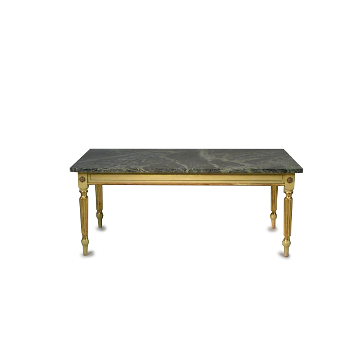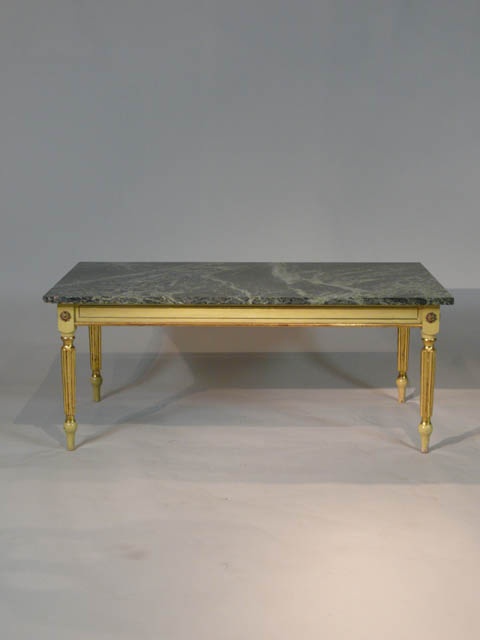 FRENCH STYLE CREAM PAINTED AND GILDED OBLONG COFFEE TABLE FLUTED LEGS WITH A GREEN MARBLE TOP 1'6/i HIGH 3'6/i WIDE 2' DEEP / 46 CM X 107 CM X 62 CM