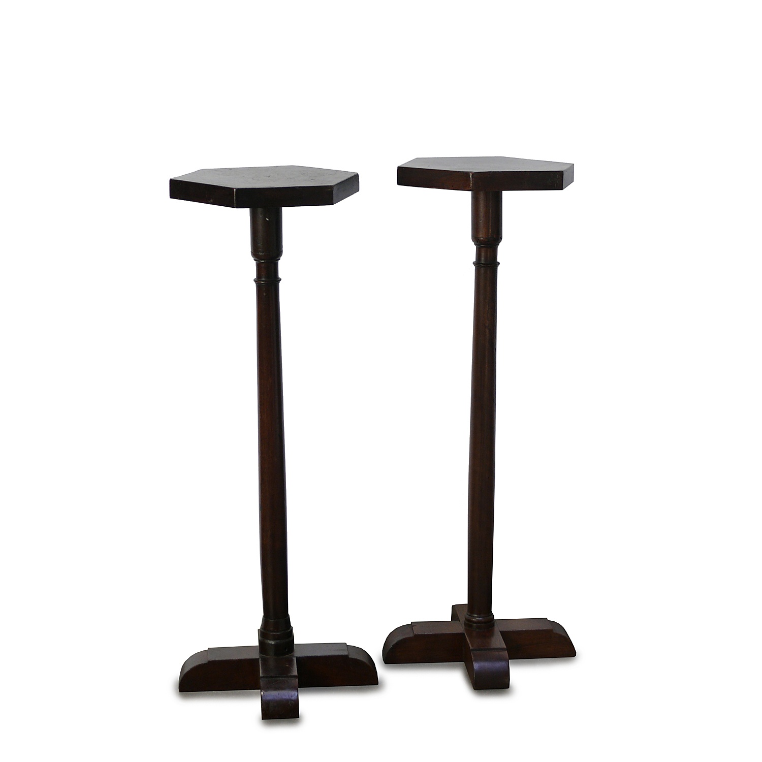 FRENCH TABLE / CANDLE STAND TURNED FRUITWOOD WITH HEXAGONAL TOP 25 CM DIAM 79 CM HIGH (X2)