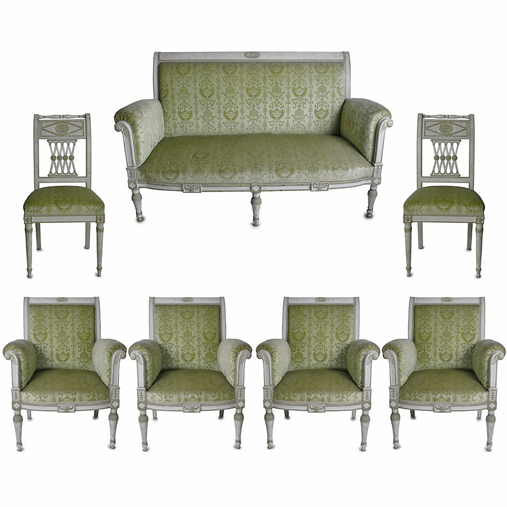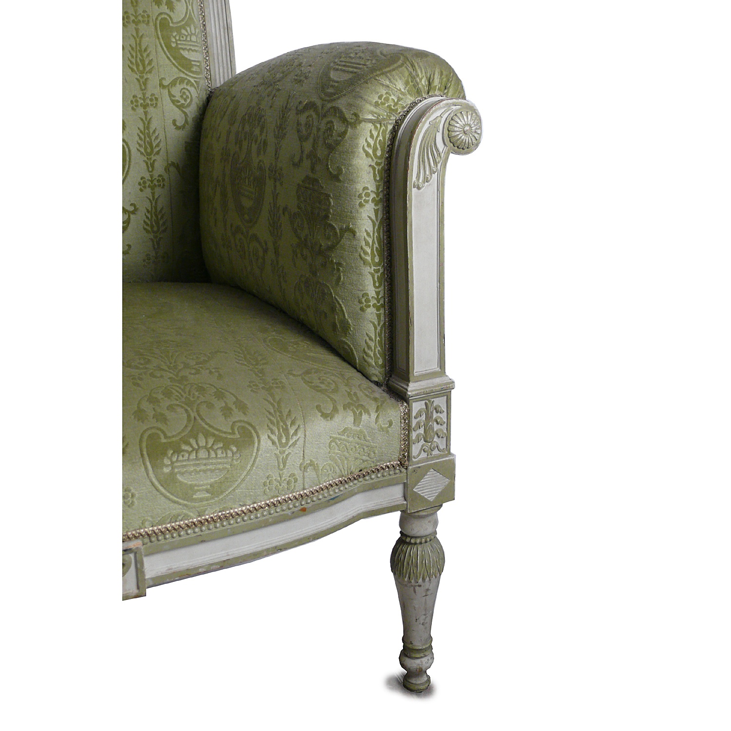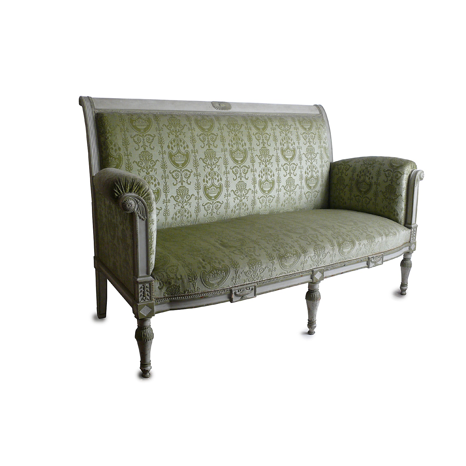 FRENCH TWO SEAT SETTEE / SOFA PALE GREEN AND CREAM WITH GREEN GENOA VELVET UPHOLSTERY DIRECTOIRE PERIOD CIRCA 1800